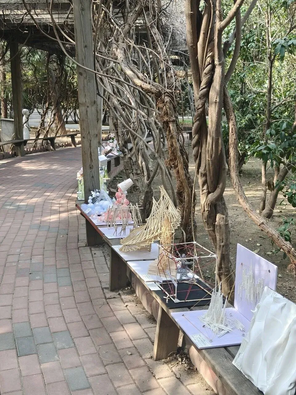 以多元材料为媒介,借由缠绕、编织、钉线等手工技法,将线条、色彩与形态巧妙融合,既有山水、花草等自然意象的诗意表达,也有几何星芒、重复纹样的理性秩序之美,在光影与肌理的碰撞中,展现了材料的可塑性与手工艺术的细腻表现力,传递出生活美学的创意温度。学生姓名:张雨绮、鄢郑敏、张天乙、吉晨雨、滑琪玥、吴礼蓉