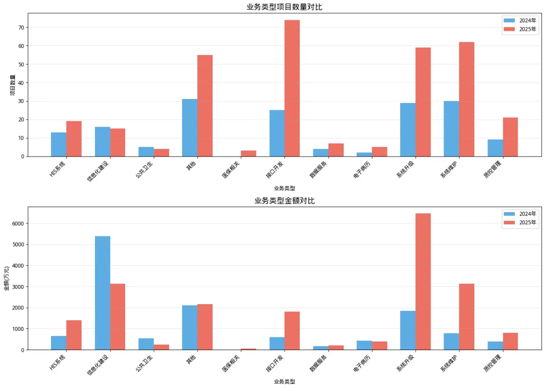 系统升级: 项目数增长103.4%,金额增长248.9%。随着医院业务的扩展和国家卫健委对电子病历应用水平、互联互通成熟度测评要求的不断提高,原有的老旧系统必须进行迭代升级。例如“扬州市口腔医院电子病历四级等信息系统升级(249.8万)”,这类项目单价较高,是公司营收增长的重要推手。