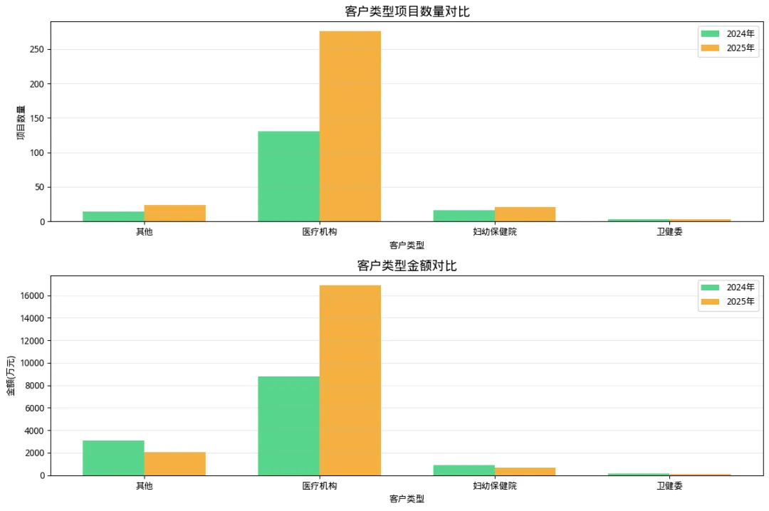 伴随项目数量的激增,公司的总营收盘子也实现了显著扩张。2025年总金额达到1.98亿元,较2024年的1.29亿元增长了53.1%。这一数据的背后,是公司在保持千万级大项目(如2024年宁蒗彝族自治县卫生健康局1163万项目、晋城市城区医疗集团998万项目)稳定交付的同时,极大地拓宽了中小型项目的长尾市场。总金额的稳步上升为公司后续的研发投入、人才引进和全国化布局提供了充足的资金弹药。