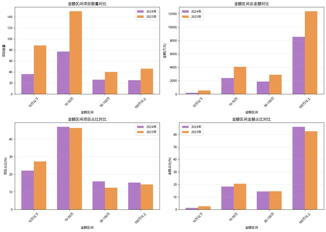 通过对项目金额进行区间划分,我们可以透视公司的订单结构和现金流健康度。2024-2025年,公司的项目结构呈现出“哑铃型”向“金字塔型”演变的健康趋势。