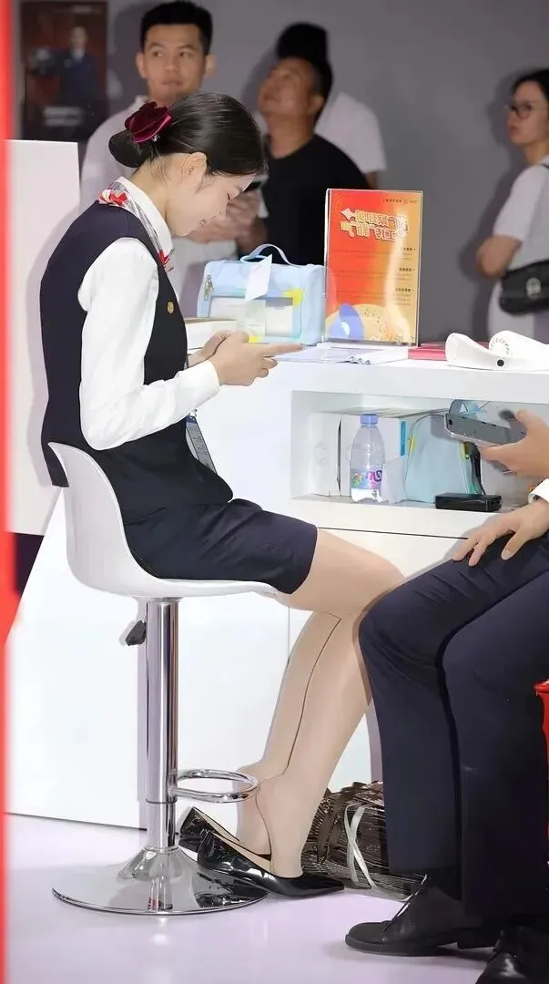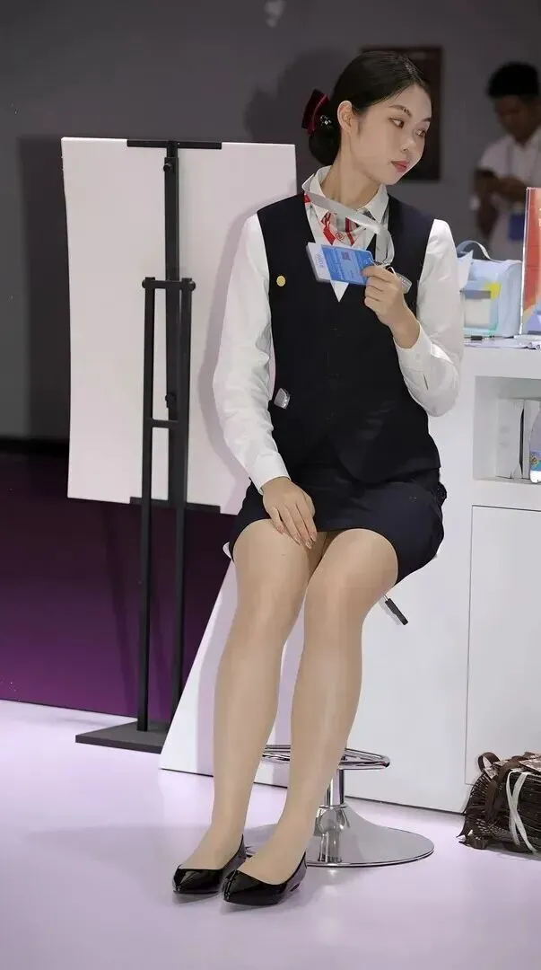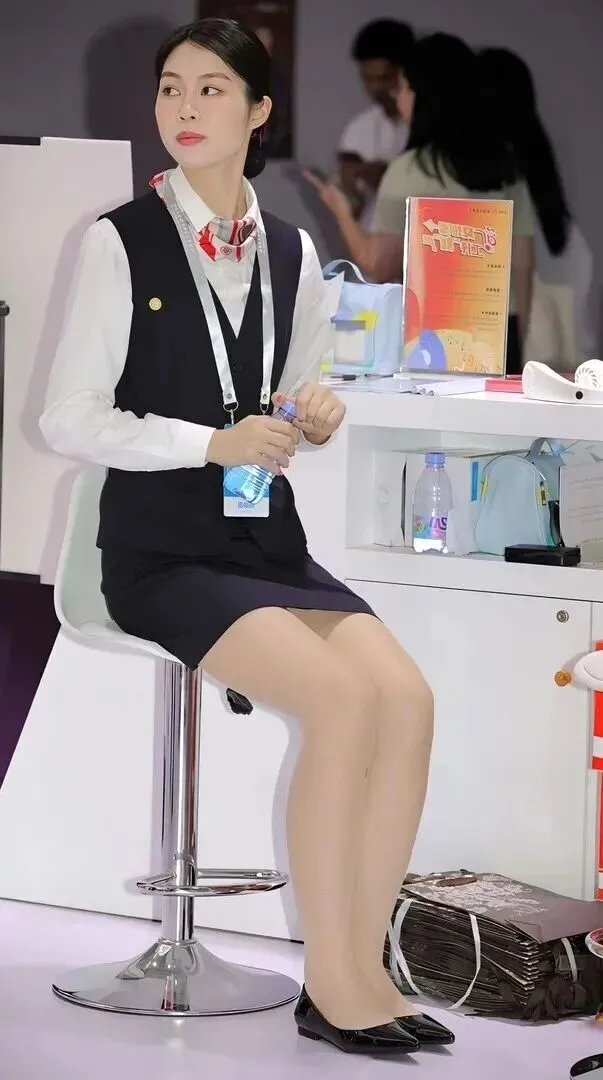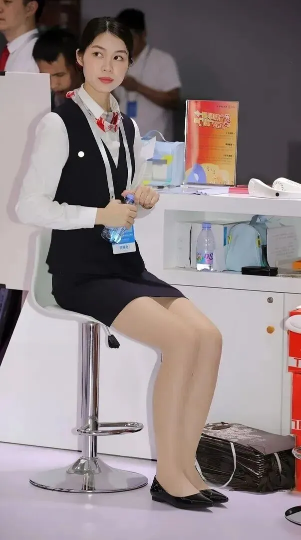 在展览会上碰见了小姐姐。在人山人海之中她静坐在白色高脚椅上,一手提着一瓶矿泉水,眼神看着远处。第一眼看到他身上的穿着就很普通,白衬衫、藏青马甲,职业装嘛。可以看上几秒钟,就被那种说不出的亲和力所吸引住了。最简单的搭配最容易让人移步接近。