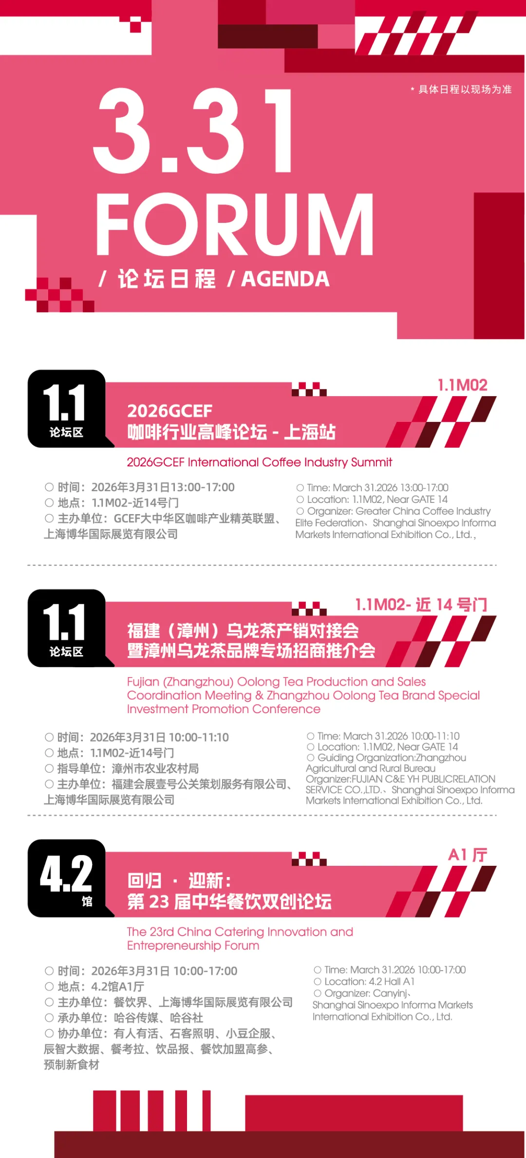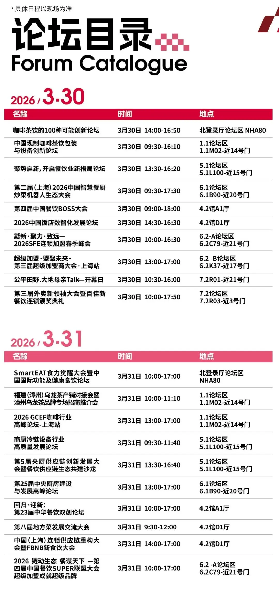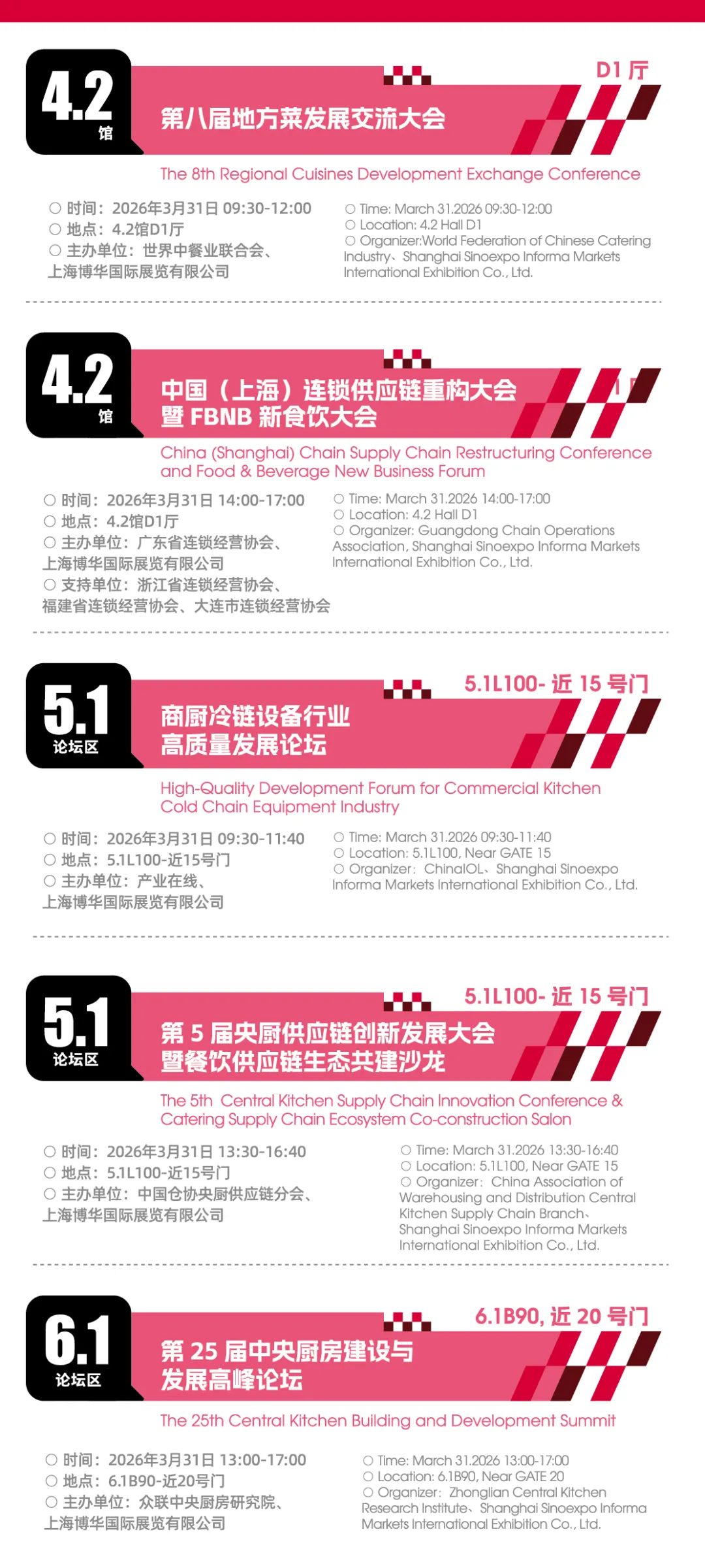 2026上海国际酒店及餐饮业博览会将于今日3月30-4月2日在上海虹桥国家会展中心举办。展会面积达40万平米,汇聚3000余家来自全球各地的参展企业,覆盖餐饮设备综合、中央厨房及食品机械设备、制冷设备、桌面用品、高端食材、饮品供应链、咖啡与茶、冰淇淋及乳制品、烘焙设备及原物料、食品餐饮包装及设计、酒水综合、特许经营及连锁加盟、自有品牌及代加工、功能食品及饮料等14大核心板块,预计将吸引全球近150个国家和地区的超过30万名专业买家,以及100+包括主题论坛、国际赛事、专题配对会、潮流市集、展区亮点打造等多种形式在内的主题活动单元,涵盖主题论坛、国际赛事、专题配对会、潮流市集、展区亮点打造等多种形式,既为行业提供前沿趋势解读、技术交流、经验分享的平台,也为从业者搭建互动体验、资源对接的渠道,丰富展会内容,提升展会价值。内附免费门票+展商名录+展馆平面图+交通指南~