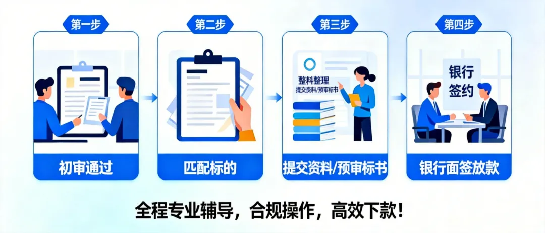 初步材料预审 → 匹配银行与方案 → 完善并提交申请 → 银行审批授信 → 合同面签 → 落实放款