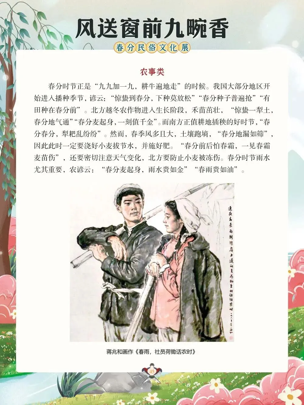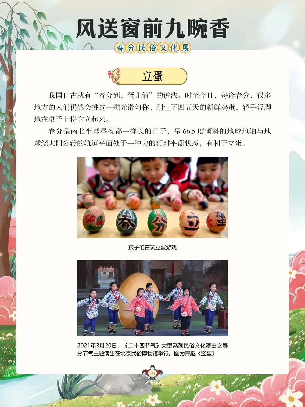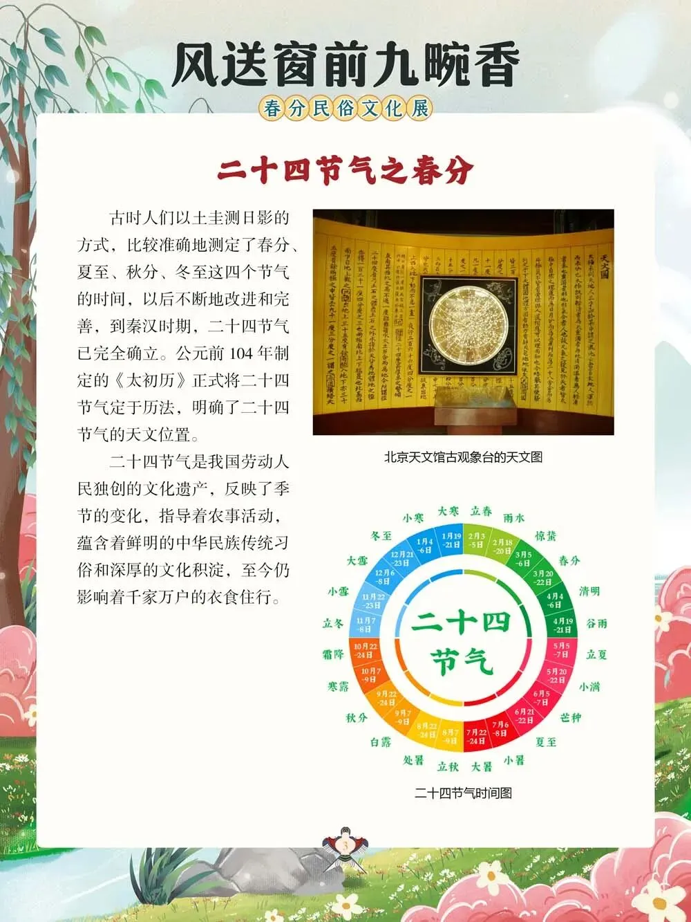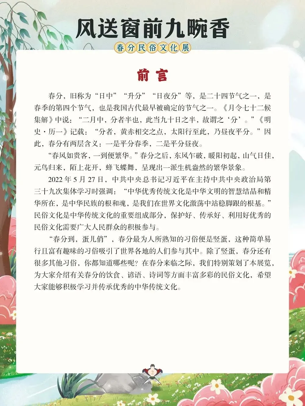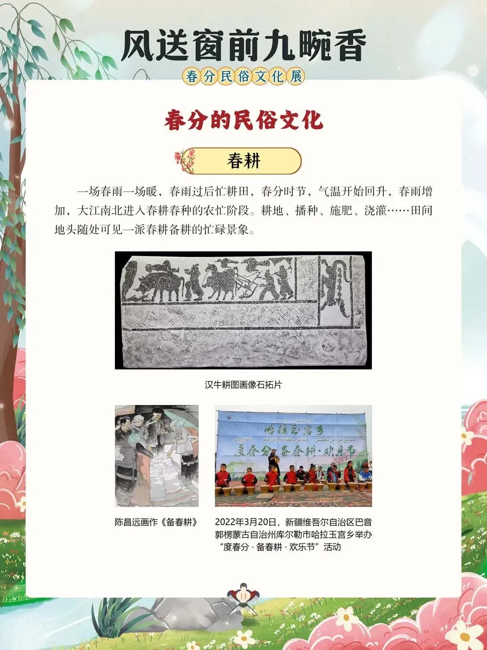本展览聚焦春分的节气内涵与民俗文化,介绍其相关的传统习俗、文化意象,助力大家了解并传承这一承载着农耕智慧与生活意趣的节气文化,感受传统文化里的自然韵律与人文温度。