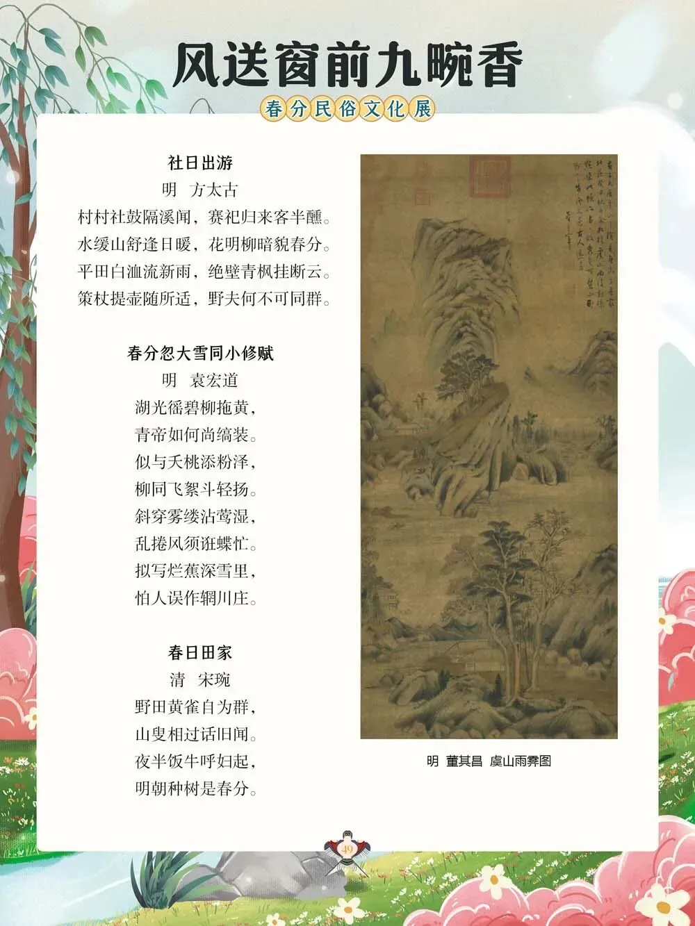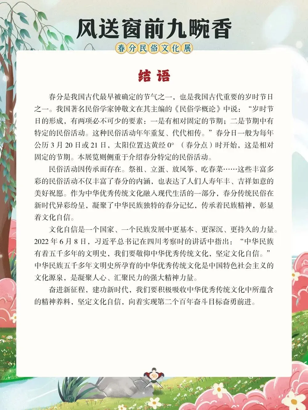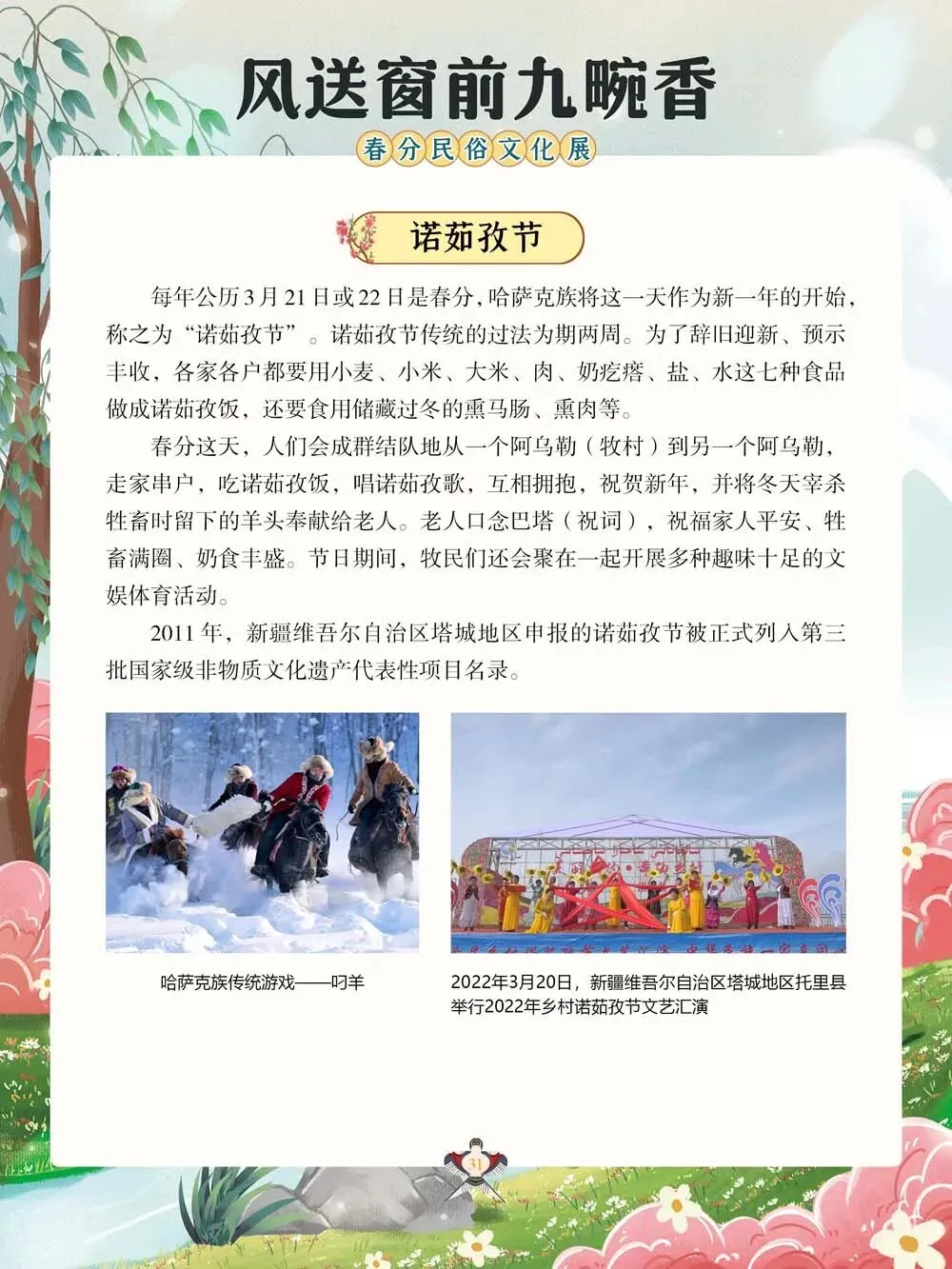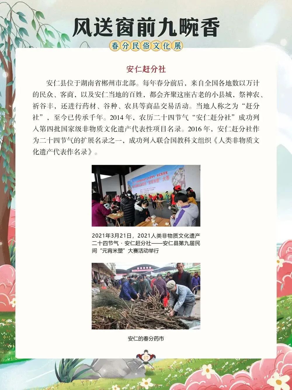 本展览聚焦春分的节气内涵与民俗文化,介绍其相关的传统习俗、文化意象,助力大家了解并传承这一承载着农耕智慧与生活意趣的节气文化,感受传统文化里的自然韵律与人文温度。
