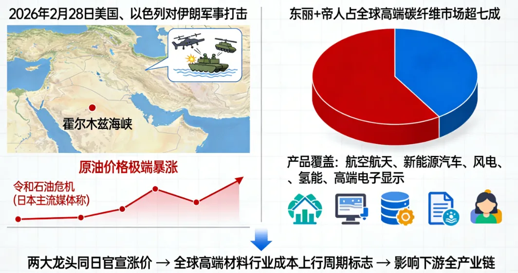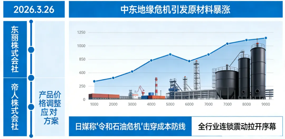 两大龙头的集体动作,背后是全球能源与供应链格局的极端剧变。自2026年2月28日美国、以色列对伊朗发动军事打击以来,中东局势持续恶化,霍尔木兹海峡这一全球能源大动脉的封锁,直接引发了原油价格的极端暴涨行情,被日本主流媒体冠以“令和石油危机”的称号。叠加全球经济复苏节奏分化、美国关税政策走向高度不明等多重不确定性,全球高端材料产业链正面临供给稳定性与成本失控的双重挤压。