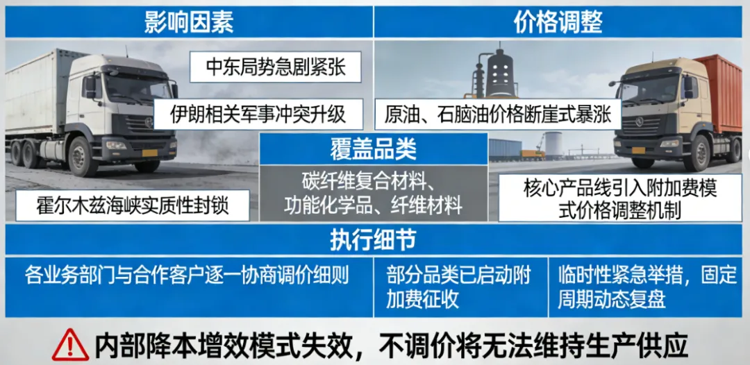 东丽在重磅紧急公告中明确,受近期中东局势急剧紧张、伊朗相关军事冲突升级及霍尔木兹海峡实质性封锁影响,原油、石脑油等核心原材料价格出现断崖式暴涨,企业将针对旗下核心产品线紧急引入附加费模式的价格调整机制。本次调价全面覆盖东丽王牌业务,核心范围为直接受石化原料价格波动影响的碳纤维复合材料、功能化学品、纤维材料等战略级品类。
