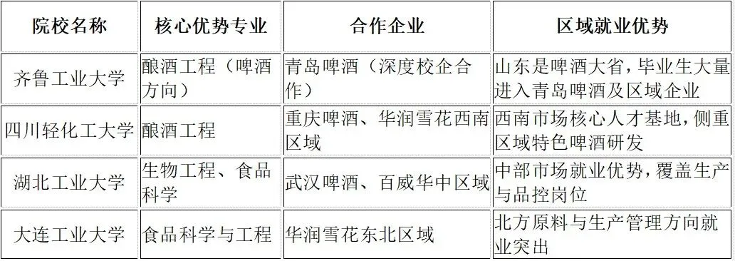 吉林大学:生物工程、食品质量与安全,与华润雪花东北、青岛啤酒东北区域合作,侧重原料品控与生产管理。