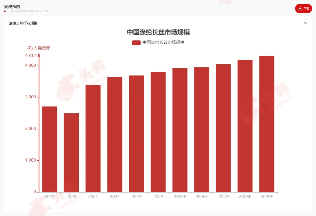 预计中国涤纶长丝行业市场规模将由2024年的3,808亿元平稳增长至2029年的4,311.18亿元,在假设产品均价基本维持在8,000元/吨附近的前提下,这一阶段市场规模扩张并非由价格上升驱动,其核心动力来自下游高性能、功能化及产业用需求的持续放量:一方面,传统服装家纺领域整体维持低速增长,但消费端对差别化、功能型长丝(如高强、高模量、阻燃、环保及再生纤维等)的需求占比不断提升,带动单位产品中涤纶长丝用量和附加值同步提高;另一方面,基建、汽车轻量化、环保材料、新能源等行业对涤纶工业长丝的应用场景持续拓展,需求呈稳步增长态势,使行业实物消费量在价格基本稳定的前提下持续抬升,从而推动2025–2029年涤纶长丝行业市场规模实现以“量增+结构升级”为特征的温和、可持续增长。