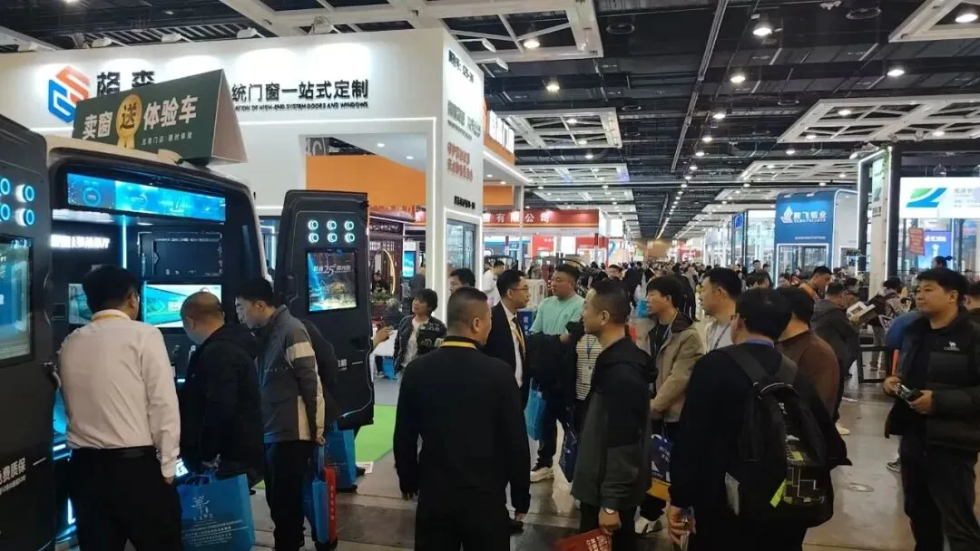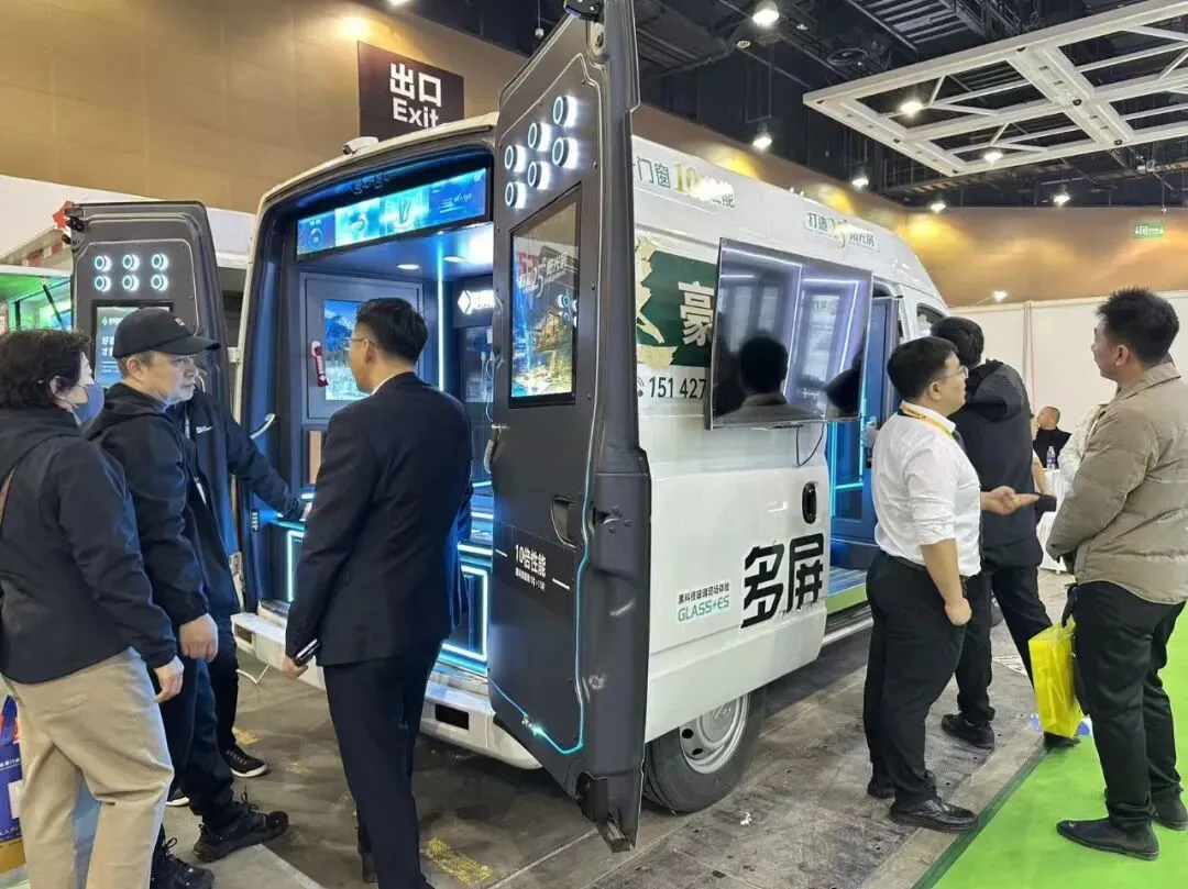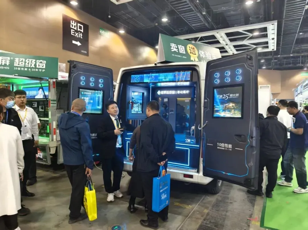 在多屏展位前,一辆辆改装过的门窗体验车成为现场焦点。车内搭载着窗户样角、玻璃样块、红外测温仪、噪音测试仪,就是一个移动的微型展厅。