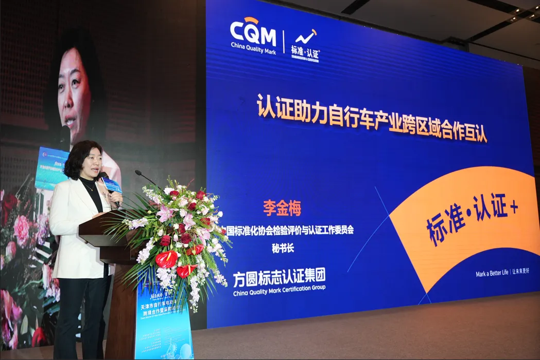 全国标准化协会检验评价与认证工作委员会秘书长、方圆标志认证集团运营总监兼天津公司总经理李金梅分享《认证助力自行车产业跨区域合作互认》