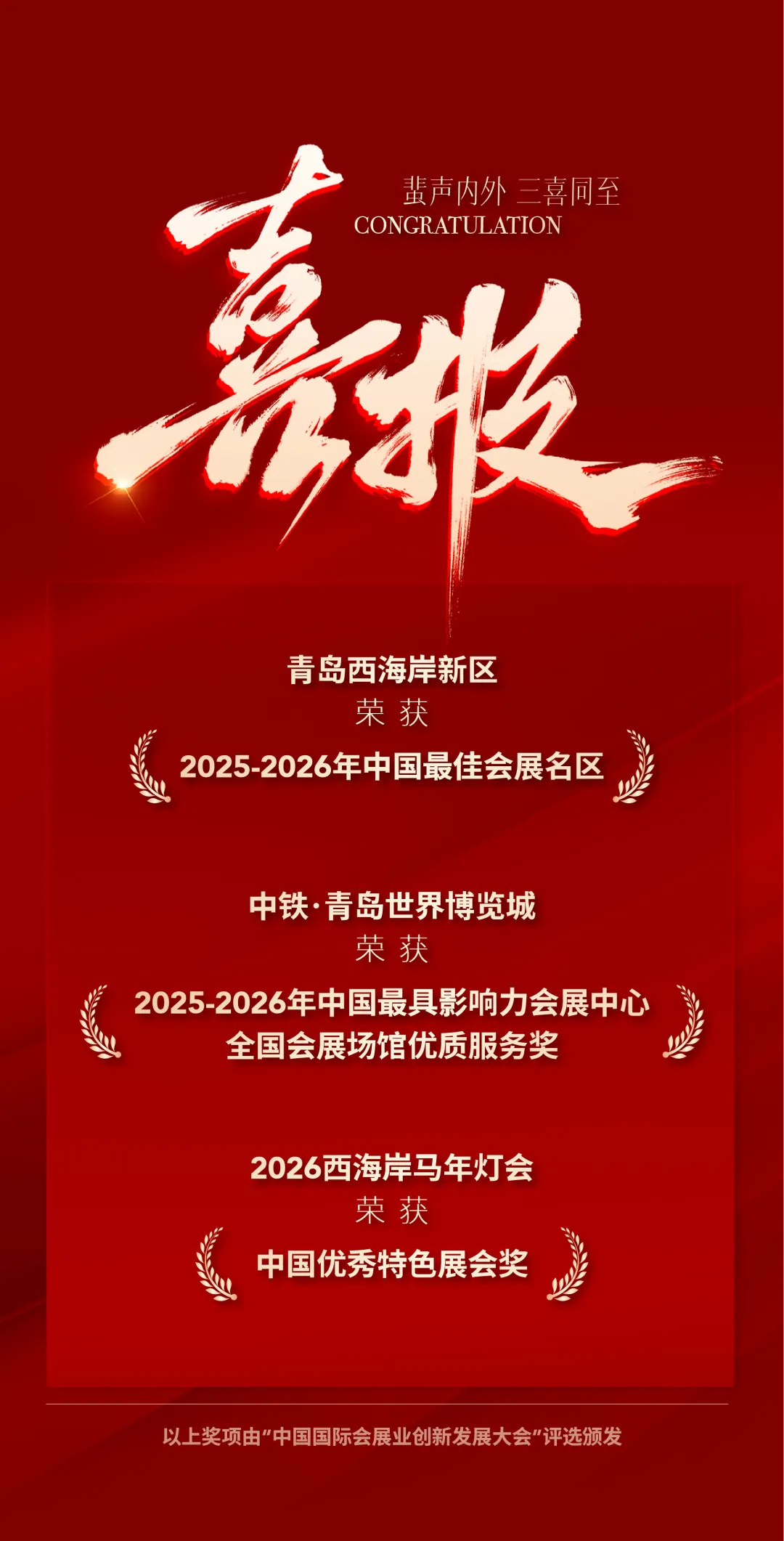 中铁·青岛世界博览城作为山东会展业代表应邀出席,与上海新国际博览中心、厦门国际博览中心等国内一流场馆同台交流。在备受瞩目的“2025-2026年中国会展产业颁奖盛典”中,西海岸新区荣获“中国最佳会展名区”,中铁·青岛世界博览城斩获“中国最具影响力会展中心”“全国会展场馆优质服务奖”大奖,2026西海岸马年灯会荣获“中国优秀特色展会奖”。三项荣誉同落一地,成为本届大会最受瞩目的焦点之一。