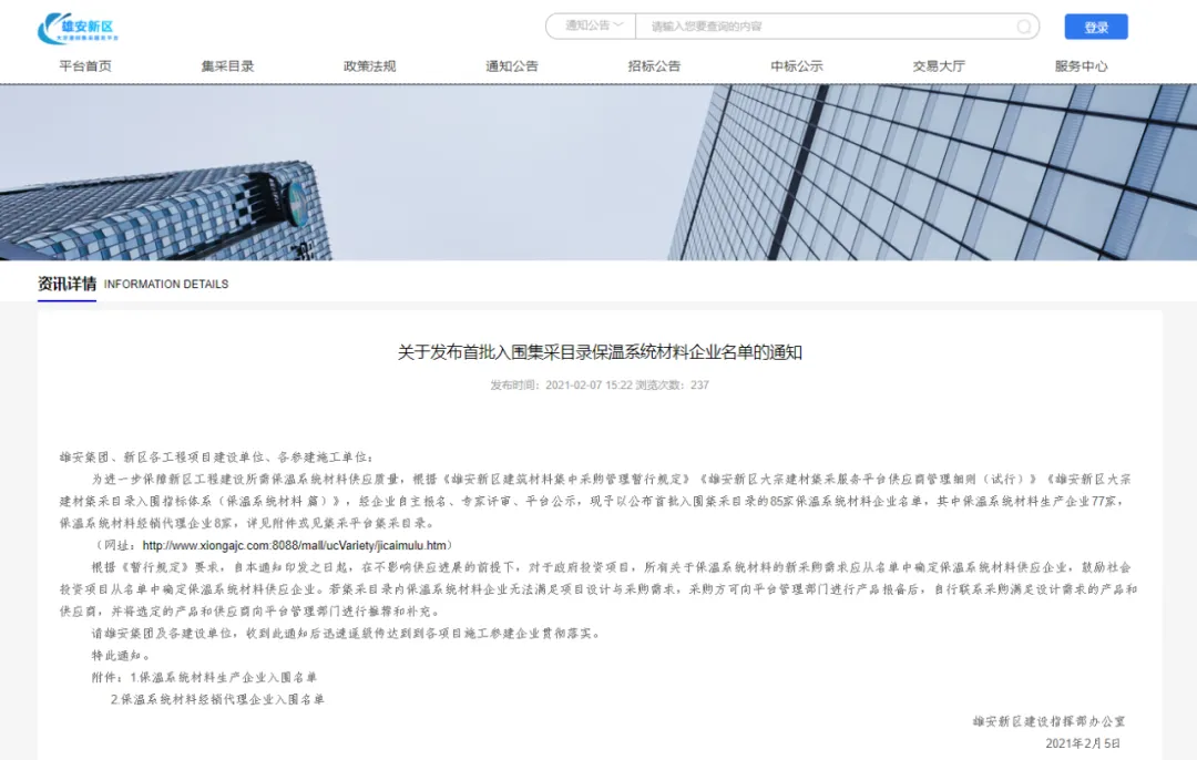 2月7日,雄安新区大宗建材集采服务平台发布《关于发布首批入围集采目录保温系统材料企业名单的通知》。