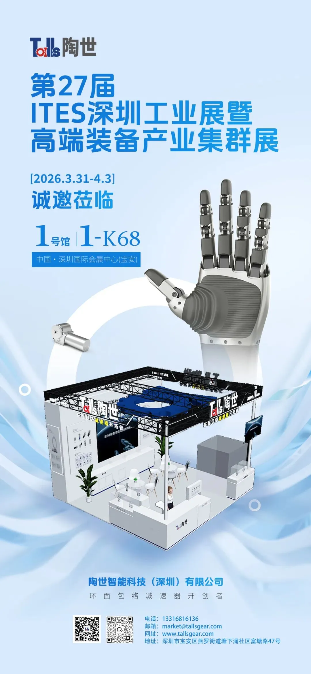 3月31日 - 4月3日,第27届ITES深圳工业展暨高端装备产业集群展将在深圳国际会展中心(宝安)盛大启幕。陶世智能科技(深圳)有限公司携核心精密传动产品、灵巧手关节模组及8自由度灵巧手重磅亮相,诚邀新老客户、行业伙伴莅临1-K68展位参观交流,共探机器人核心部件与智能末端执行新方案。