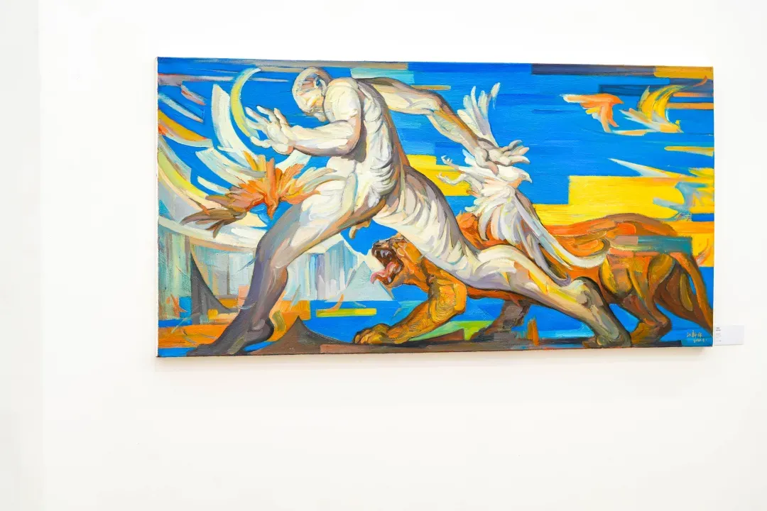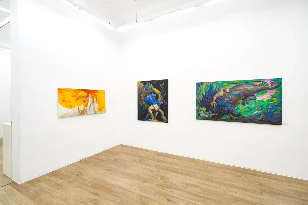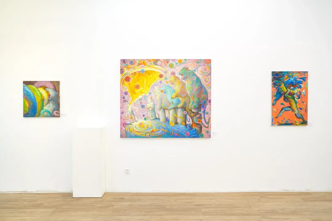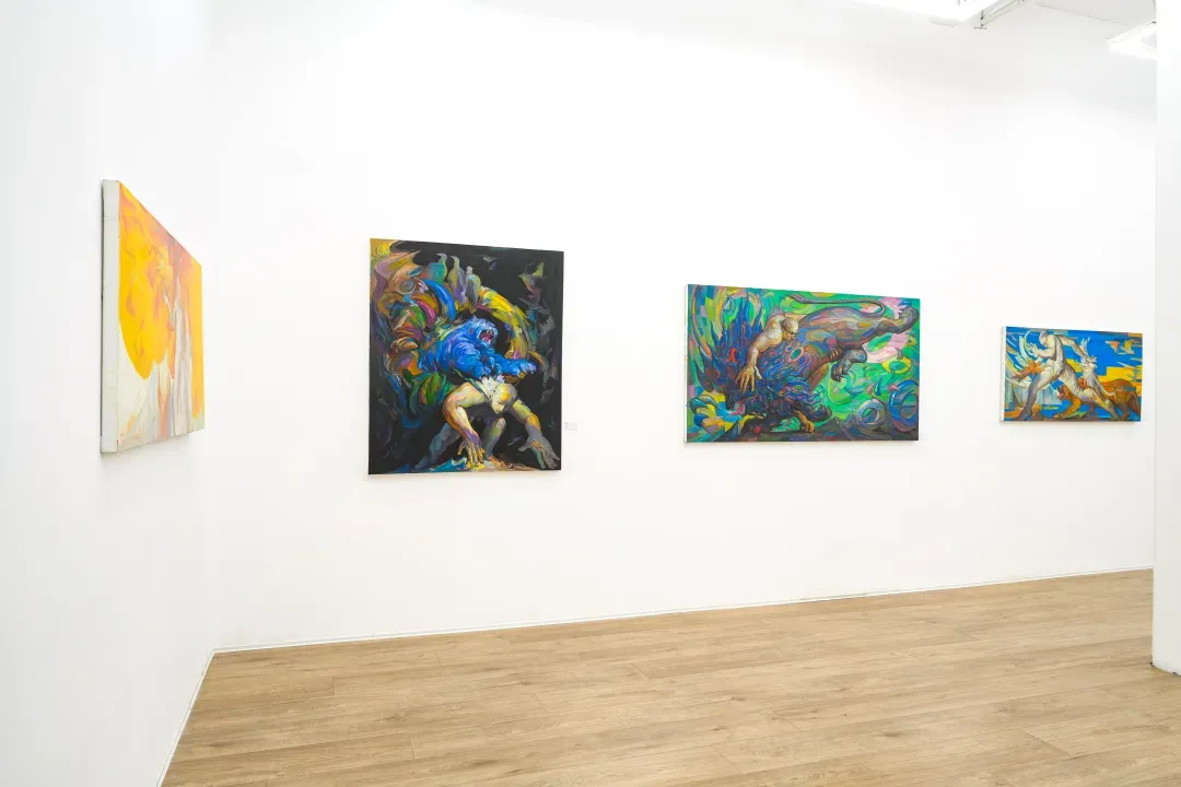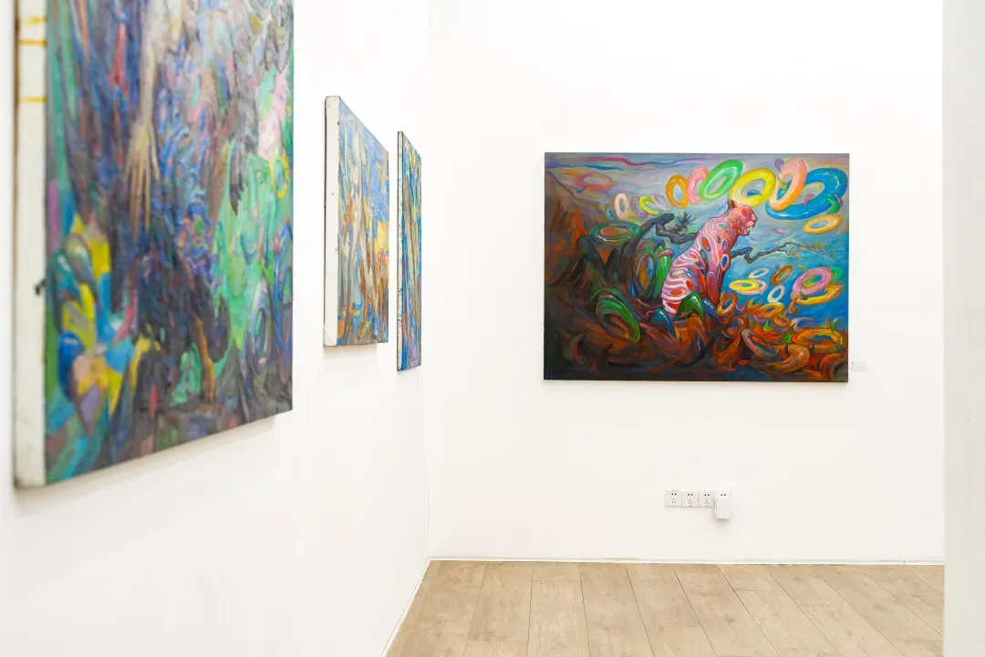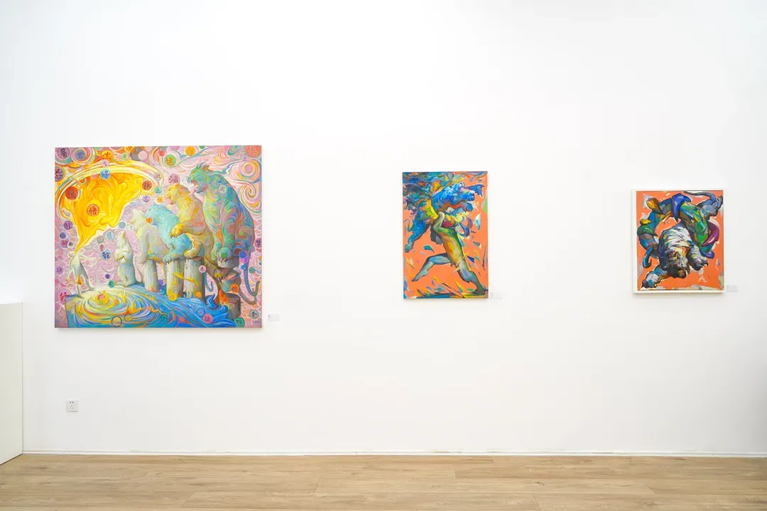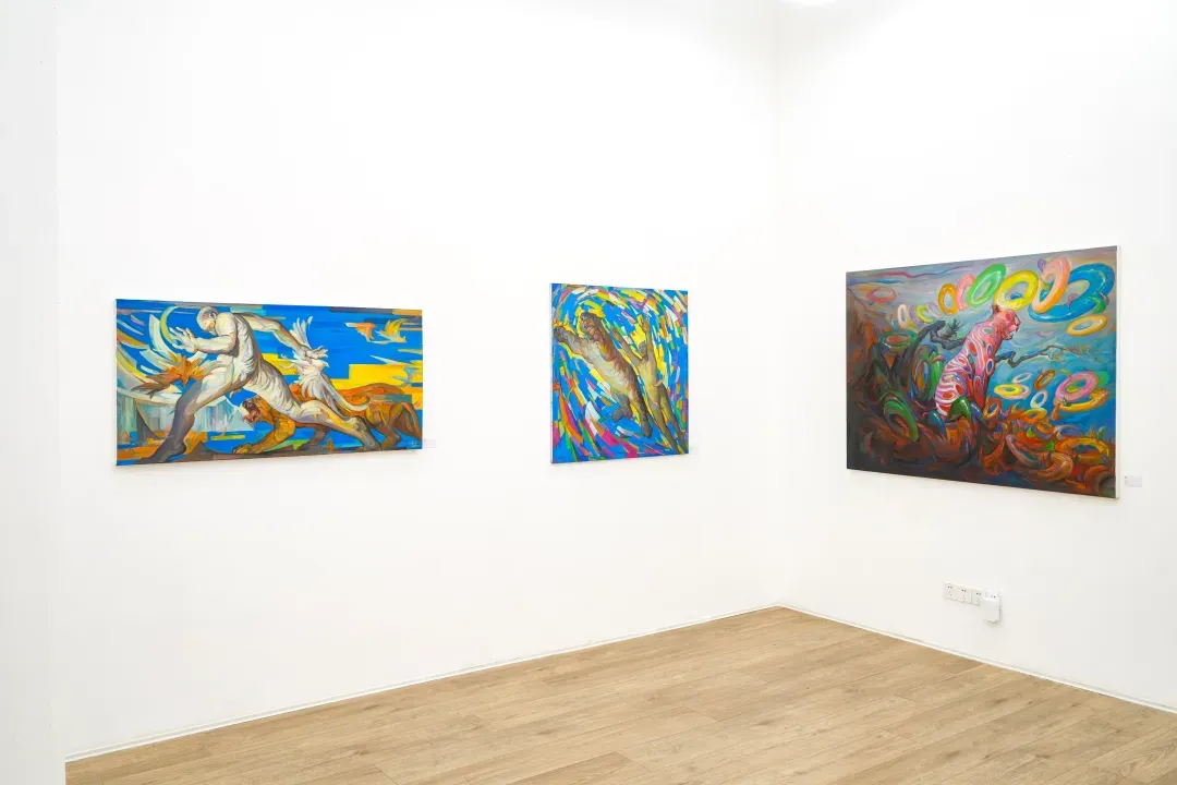 在這些畫面裡,動物不只是象徵自然或野性,而是人性中被壓抑、被忽略的部分;人物也不再是理性的主體,而是一種持續變動的存在狀態。江新林透過誇張的色彩與變形的形體,探討人與自然之間深層而複雜的情感連結,挑戰我們對身份、角色與界線的既定想像。