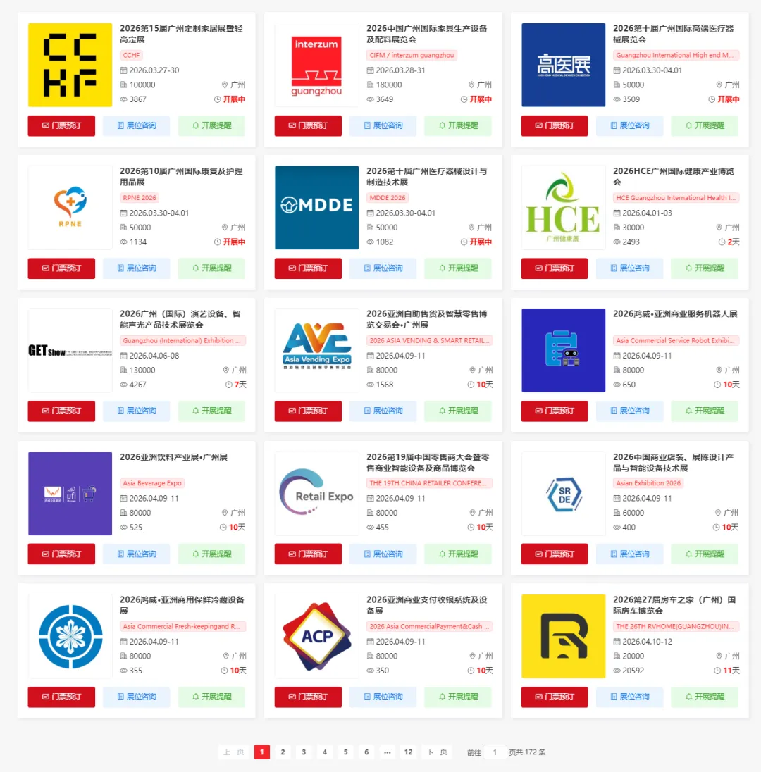 2026年4月广州将举办多场重要的展会活动,涵盖了医疗器械、康复矫形、医疗器械、保健、灯光舞台、机器人、冷链、零售、饮料、软件、房车、五金、贸易、工业、礼品、家具、建筑工程、地坪、混凝土、建材、体育用品、民宿、旅游、台球、旅游、vrar、休闲运动车、旅游、灯光舞台、餐饮、加盟、烘焙、健康、茶叶、花卉、泳池桑拿、园林、游艇、运动展等多个领域。小编为大家整理了4月广州全年展会排期表,希望能帮助你规划行程。末文获取广州展会门票预约入口~(大部分限时免费)