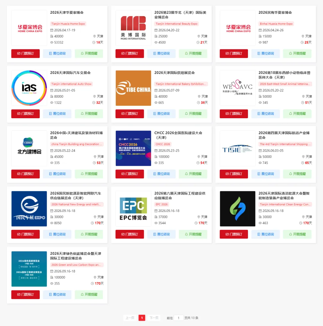 2026年天津将举办多场重要的展会活动,涵盖了家具、美容、汽车、烘焙、宠物、建材、医疗器械、物流、能源、汽车供应链、建筑工程、环保展等多个领域。小编为大家整理了天津展会20226时间表,希望能帮助你规划行程。末文获取天津展会门票预约入口~(大部分限时免费)