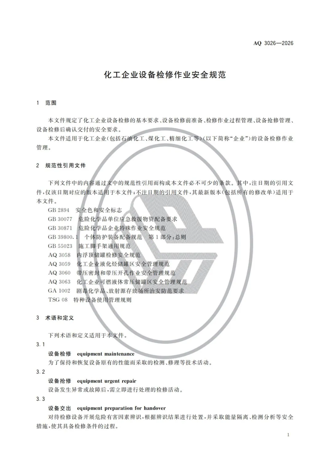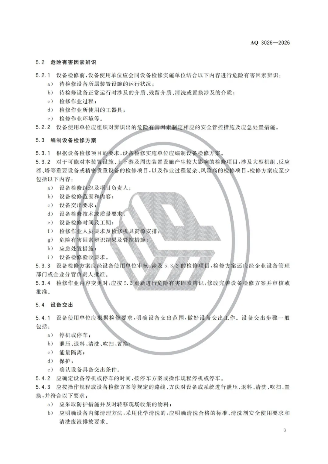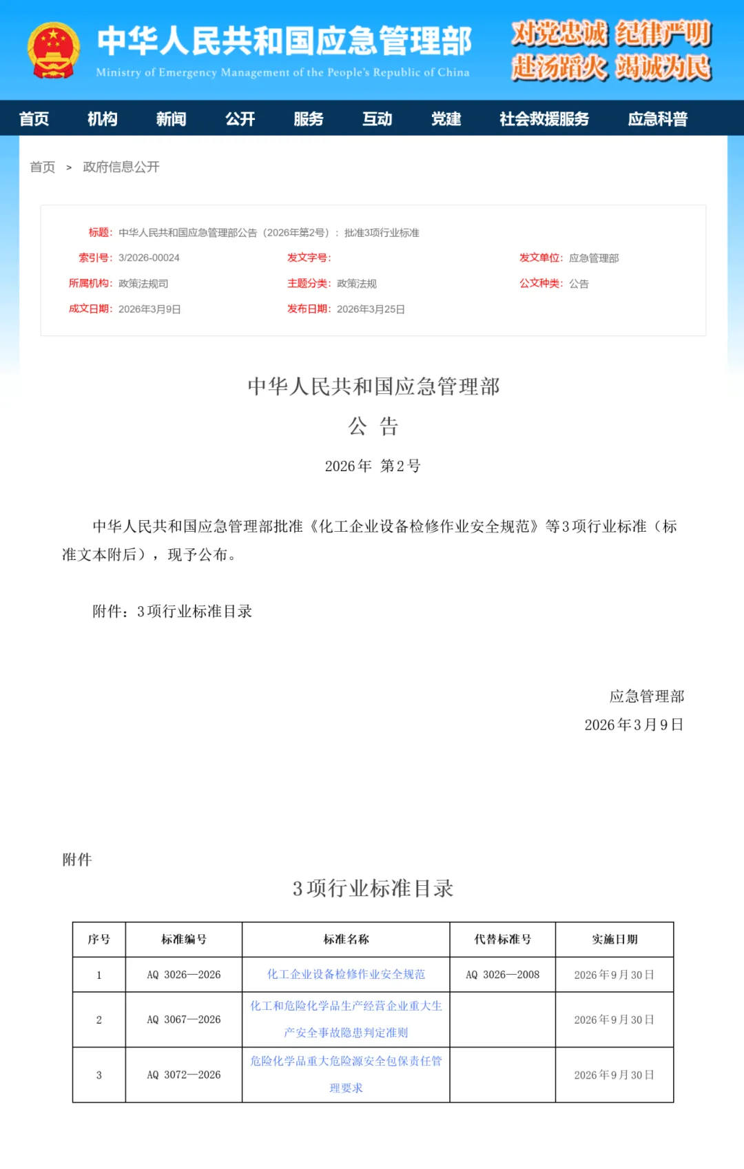 中华人民共和国应急管理部批准《化工企业设备检修作业安全规范》等3项行业标准(标准文本附后),现予公布。