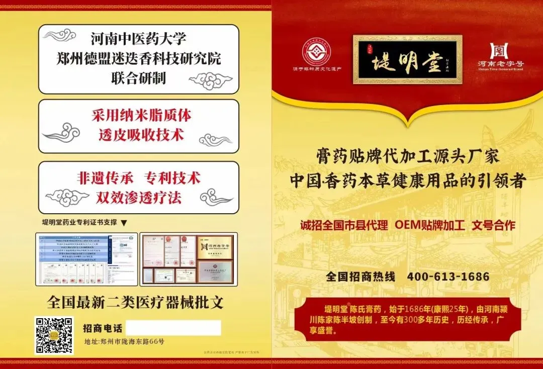 堤明堂药业始于1686年(康熙25年),总部位于河南省会、夏商古都—郑州,是一家集迷迭香高效种植、活性成分萃取、高附加值产品开发,成果转化及批文注册为一体的守正创新型高科技集团公司。公司现拥有一、二类医疗器械、消字号、健字号、SC食品等多种生产资质。主营贴剂、膏剂、水剂、粉剂、保健食品,香料香精等多类型产品。堤明堂生产的非遗"陈半坡"老黑膏疼痛系列,“陈半坡”儿科纯手工蜂蜜膏系列,省科技成果转化"澈眸"迷迭香护眼系列、“迷妖”私护系列、爱上迷迭香"精油、纯露,迷迭香养发膏科技萃取系列产品后,代理当场签约代理,并对堤明堂双品牌守正创先的稳定发展赞不绝口。