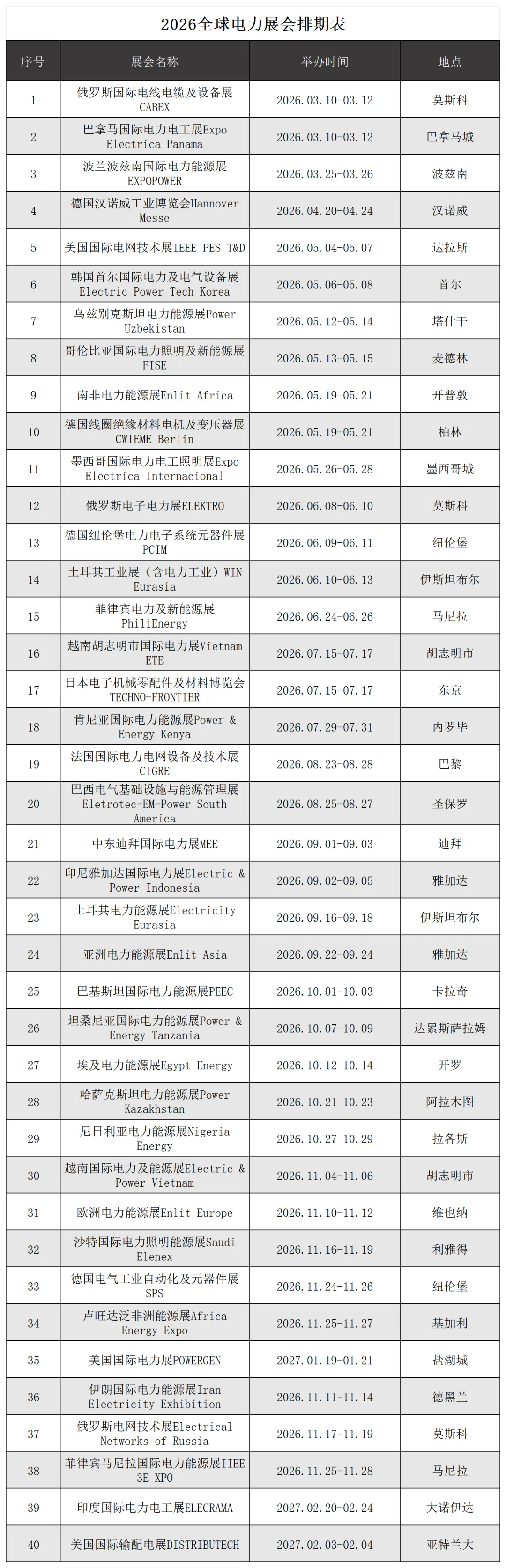 2026年,全球电力行业站在结构转型与需求爆发的关键节点,正经历深刻变革。随着可再生能源成为全球主要电力来源,储能、智能电网、高压直流输电等前沿技术加速落地,叠加AI、电气化带来的电力需求激增,全球电力市场格局持续重塑,亚洲、中东、拉美等区域成为产业增长新蓝海。为助力行业企业精准把握市场机遇、对接前沿技术与商贸资源,特整理2026年全球重点电力展会排期,为企业拓展全球业务、抢占转型先机提供参考。