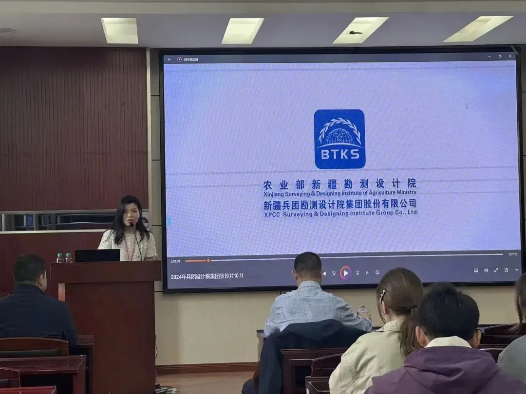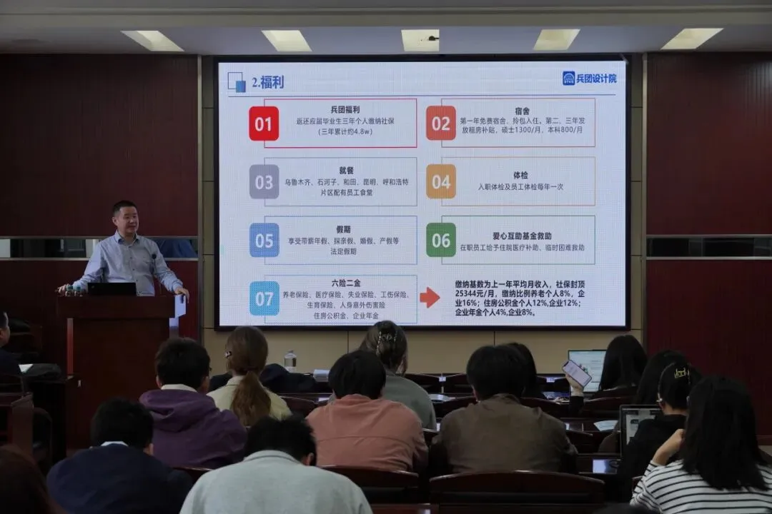 白晓明部长为同学们带来了全面的企业宣讲。他详细介绍了新疆兵团勘测设计院的历史底蕴与综合实力——企业成立于1952年,不仅具备多项综合甲级资质,更积极响应国家“一带一路”倡议与新疆的战略定位。