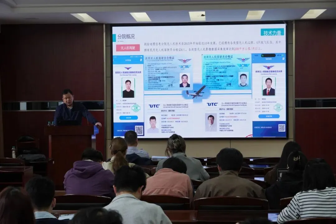 随后,李坚校友从专业视角出发,对测绘地理信息分院进行了深度推介。他介绍道,分院目前拥有138名员工,业务涵盖测绘工程、地理信息系统工程、界线与不动产测绘以及林业工程咨询四大核心板块。他结合详实的图文资料,向资环学院80余位本研学生展示了分院近年来的硬核业绩,包括兵团十四个师市的GNSS控制网项目、大型水利水电工程测绘、以及兵团国土调查和地下管网普查等大型项目。通过这些真实的项目案例,他生动解析了实景三维建模、工程测量等热门领域的技术难点与应用前景,帮助同学们将书本知识与实际工程紧密相连。