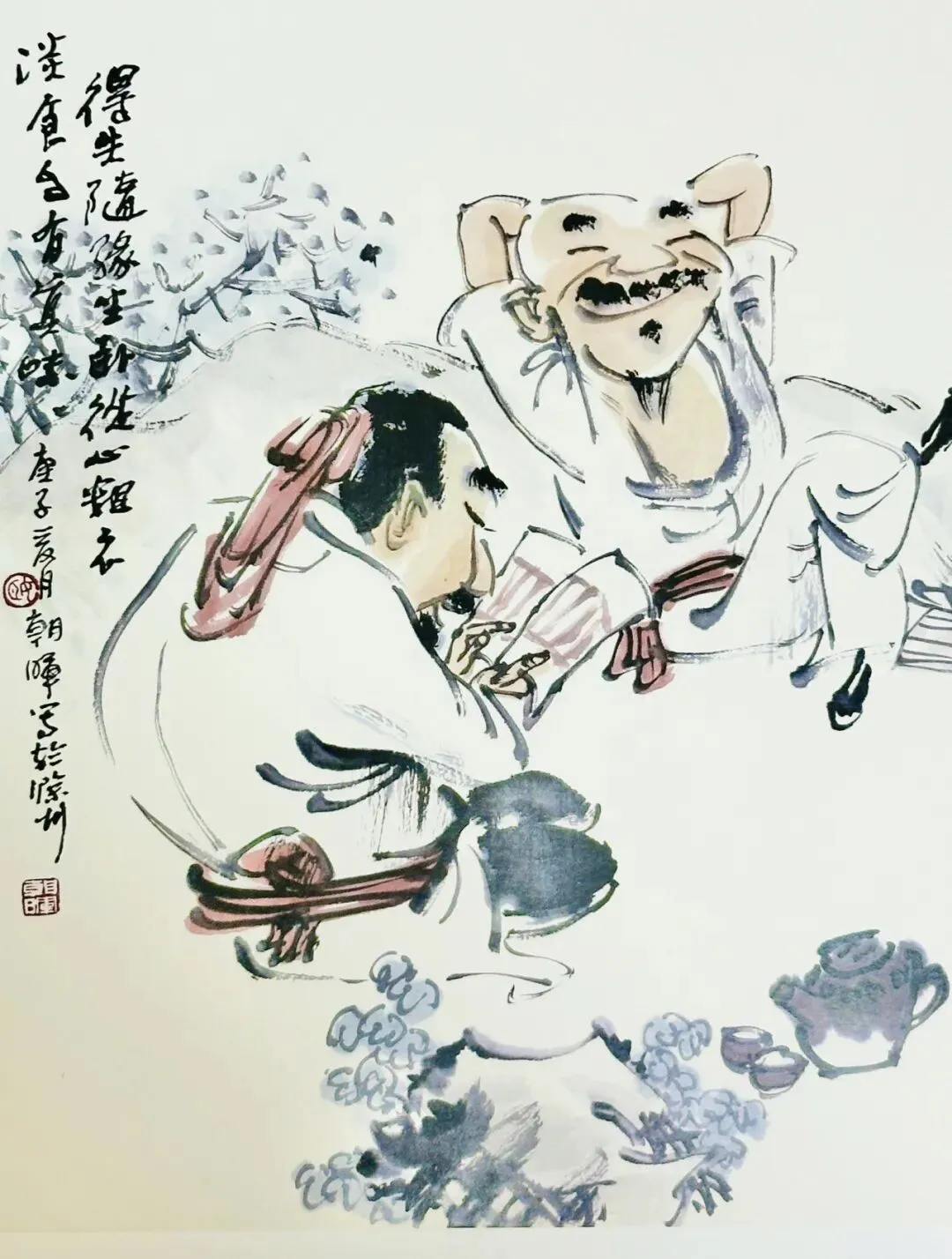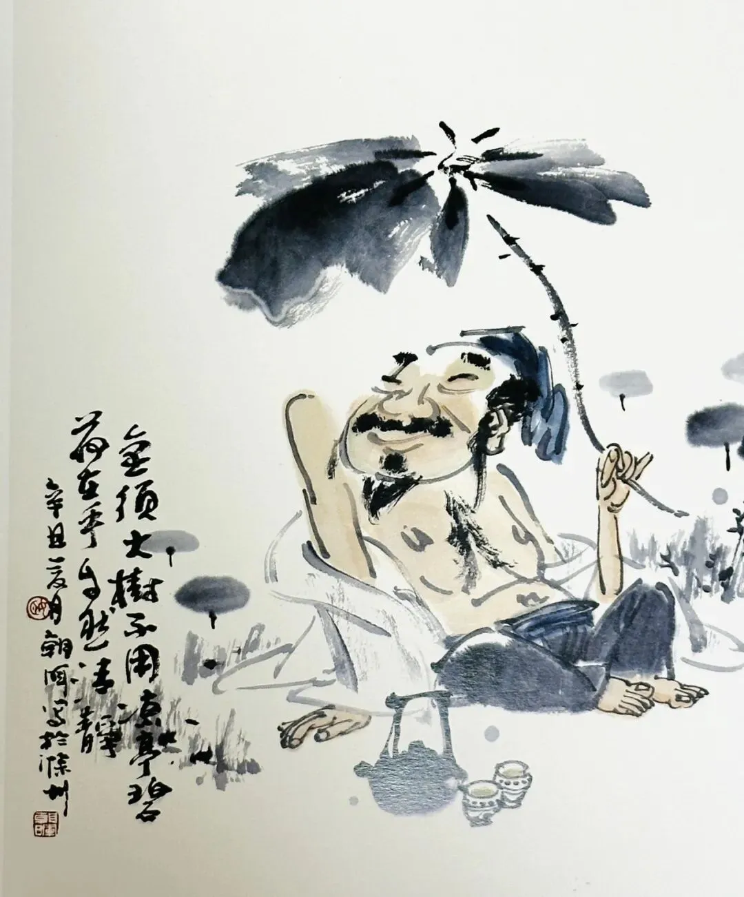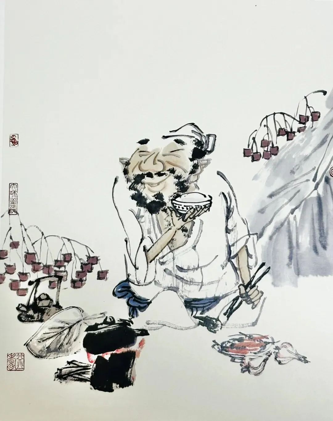 临近退休之际,姬朝晖先生开辟艺术新境,转修国画,主攻水墨人物,兼涉蔬果与山水,一画便是十多年。他大胆探索,将漫画的夸张变形、诙谐幽默与文人画的闲适随性、笔墨情趣融为一体,打破了传统人物画的刻板印象,初步形成了独具个人风貌的艺术风格。其作品既有漫画的深刻哲理,又具中国画的传神韵致,观之令人轻松愉悦,回味无穷。
