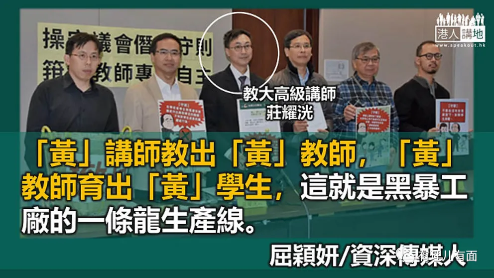 许多人问:为什么香港年轻人这么“黄”?因为学校“黄”、教师“黄”,所以年轻人变“黄”变“暴”的机会也大。于是大家又问:为什么香港教师会这么“黄”?那就要“归功”于我们的教师工厂及教师工会了。香港最大的教师工会“教协”有多黄?不用多介绍,但这工会几十年来在教育界埋下的“黄”种,却是多到你估算不到,其中一些种子,不单是撒在学校,还撒在教师工厂《教育大学》,以下就给大家举个例。日前宣道小学教师播“独”而被教育局除牌事件,敲醒大众对教师问题的关注。有人翻出2014年占中时的旧片,那是教协为教师举办的“教师权益法律讲座”,主讲人是律师庄耀洸,他讲的所谓教师法律权益,原来是被警察拘捕时遇到以下五个状况该如何玩弄法律权利,包括:庄耀洸说,这是公民基本的认知,就算老师用不着,也可作为教学用。言下之意,你不被捕,你教的学生可能会被捕,所以及早教大家应对之法。整个讲座,简单而言,就是用法律知识,教你逃避法律责任,举个例,庄耀洸教大家被捕之后,要记住“缄默权”:“你有权不答警察问题,什么都不讲,他也不能怎么样。但姓名地址例外,你一定要讲,否则警察不会放你……”如果真的被捕留案底了,庄耀洸又教老师用法律漏洞讲大话隐藏自己的污点:“1986年有条俗称洗底的‘罪犯自身条例’,譬如你去应聘,当人家问你有没有案底,你可以说无,这不是讲大话,因为根据‘罪犯自身条例’的条件,如果你犯的罪,一,判监不超过三个月;二,罚款不超过一万;三,案底过了三年后没再被定罪。基于以上三条件,人家问你有没有案底,你就可以说没有。”其实,这条“罪犯自身条例”对于要考取资质的工作是不适用的,如保险、教师,但庄律师竟然在一个给教师的讲座教这些避走于法律边缘的手法,而他的原因只是“你可能会转行嘛!”大家可能会以为,庄律师只是做一个教师讲座,祸害不了太多人,那你就错了。庄耀洸虽然有个律师牌,但他已离开法律界,进了教育界。这个教老师如何逃避法律责任的人,现在却是教育大学教育及人类发展学院高级讲师,也是教协副会长,他正正就是我上面提及的那种黑暴种子。1991年毕业于中大政治及行政系的庄耀洸,一离开校园就当上司徒华议员助理,做了三年,再进港大念法律。当上律师,打了一些人权案,庄耀洸就开始四处讲法律,主要是教协搞的讲座,曾经试过每年讲超过500小时,返工这样返,也因此拿了律师会颁发的“杰出公益法律服务奖”。2004年开始在中大兼教法律,2007年更当上教育大学全职讲师,从此不再执业,成为老师的老师。上网看过庄耀洸在教大上载的教学内容,其中一章叫“教师慎防误堕法网之道歉篇”,就是教老师如何利用《道歉条例》第8条“道歉行为不会成为呈堂时的不利证据”,来面对学校对教师错误行为作纪律聆讯时,避过法律责任。“黄”讲师教出“黄”教师,“黄”教师育出“黄”学生,这就是黑暴工厂的一条龙生产线。