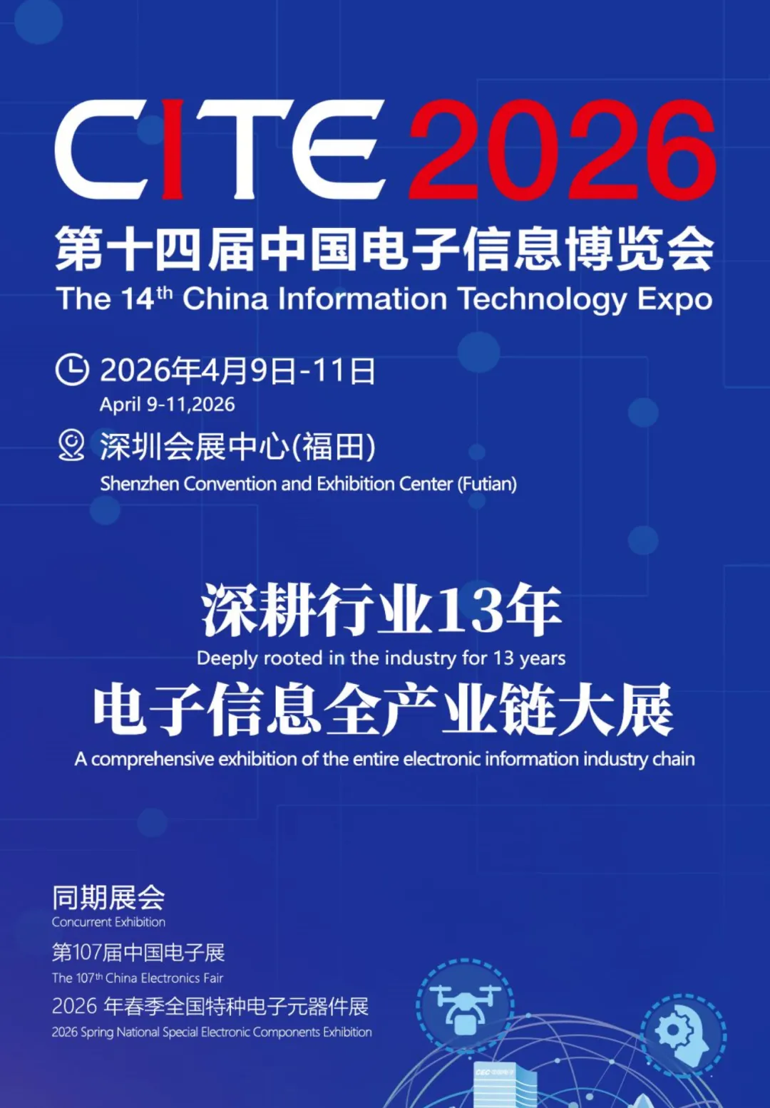 2026中国电子信息博览会将于4月9-11日在深圳会展中心(福田)举办。CITE电博会是集中展示全球电子信息产业最新产品和技术的国际级平台,经过十三年沉淀,现已成为亚洲极具规模和影响力的电子信息博览会。展会聚焦消费电子、具身智能、AI+应用场景、集成电路、低空经济、AI算力、数据存储、电子元器件、半导体、特种电子元器件等热门领域。