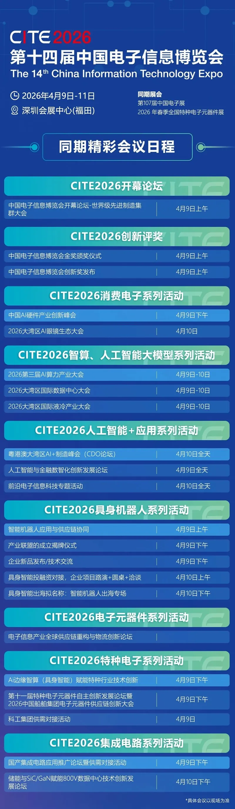 第十四届中国电子信息博览会(CITE2026)将于2026年4月9-11日在深圳会展中心(福田)盛大开幕,倾力打造打造五大主题展馆新一代信息技术创新应用馆、AI算力&数据中心馆、两用电子技术馆、全国特种电子元器件馆和核心先导元器件馆,并精细划分超20个主题展区,通过“主题馆+细分展区+精准定位”的立体化布局构建从材料、零部件、设备到终端应用的全产业链生态,以前瞻性视野汇聚全球顶尖技术成果。