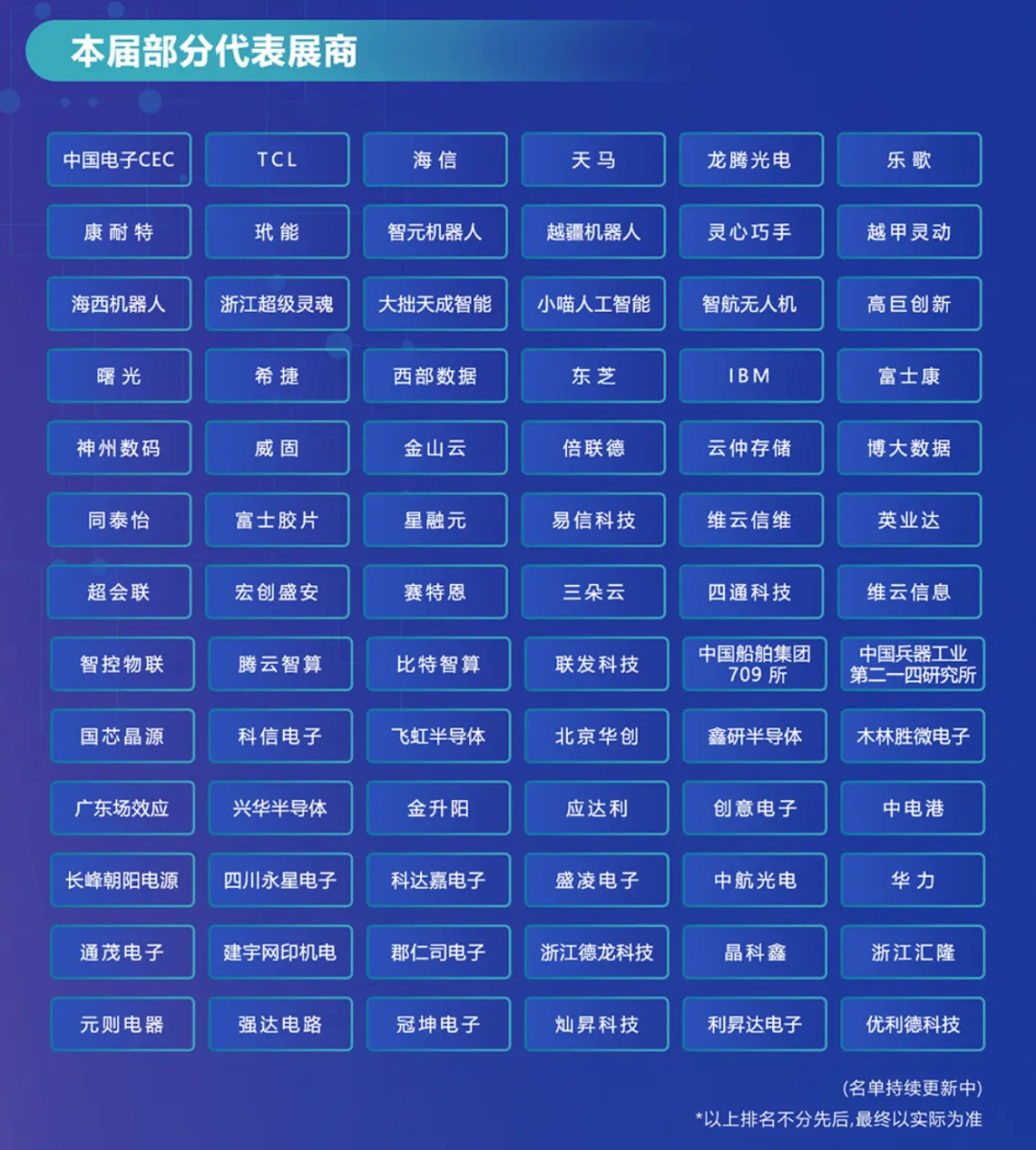 本届展会吸引了中国电子CEC、TCL、海信、天马微电子、乐歌、康耐特、玳能、智元机器人、越疆机器人、灵心巧手、越甲灵动、海西机器人、浙江超级灵魂、大拙天成智能、小喵人工智能、曙光、希捷、西部数据、东芝、IBM、富士康、神州数码、威固、金山云、倍联德、云仲存储、博大数据、同泰怡、富士胶片、星融元、易信科技、维云信维、英业达、超会联、宏创盛安、赛特恩、三朵云、四通科技、维云信息、智控物联、腾云智算、比特智算、联发科技、中国船舶集团709所、中国兵器工业第二一四研究所、国芯晶源、科信电子、飞虹半导体、北京华创、鑫研半导体、木林胜微电子、广东场效应、兴华半导体、金升阳、应达利、创意电子、中电港、长峰朝阳电源、四川永星电子、科达嘉电子、盛凌电子、中航光电、通茂电子、建宇网印机电、郡仁司电子、浙江德龙科技、龙耀芯、华力、晶科鑫、浙江汇隆、元则电器、强达电路、冠坤电子、灿昇科技、利昇达电子、优利德科技、振华集团、电科产业基础研究院、电科芯片技术研究院、沈阳兴华航空、贵州天义电器等行业领军参展企业(以为部分代表展商,排名不分先后,名单持续更新中)。众多参展企业将携超5000项新技术、新产品集中亮相,全面覆盖从基础材料、核心元器件、制造设备、智能终端到行业应用解决方案的全产业链生态,共同打造一场引领电子信息产业发展的科技盛宴。