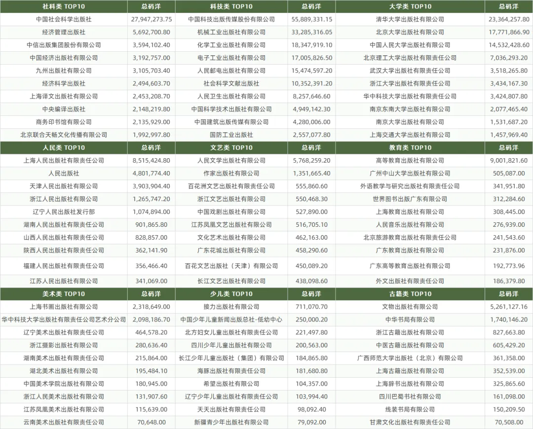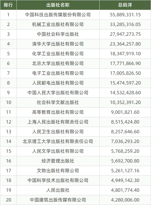 本届图采会参展的403家出版单位中,中国科技出版传媒股份有限公司(以下简称“中国科传”)以超5588万元码洋领跑,机械工业出版社、中国社会科学出版社紧随其后。科技类与大学类出版社表现亮眼,市场份额向头部集中,专业出版优势凸显。
