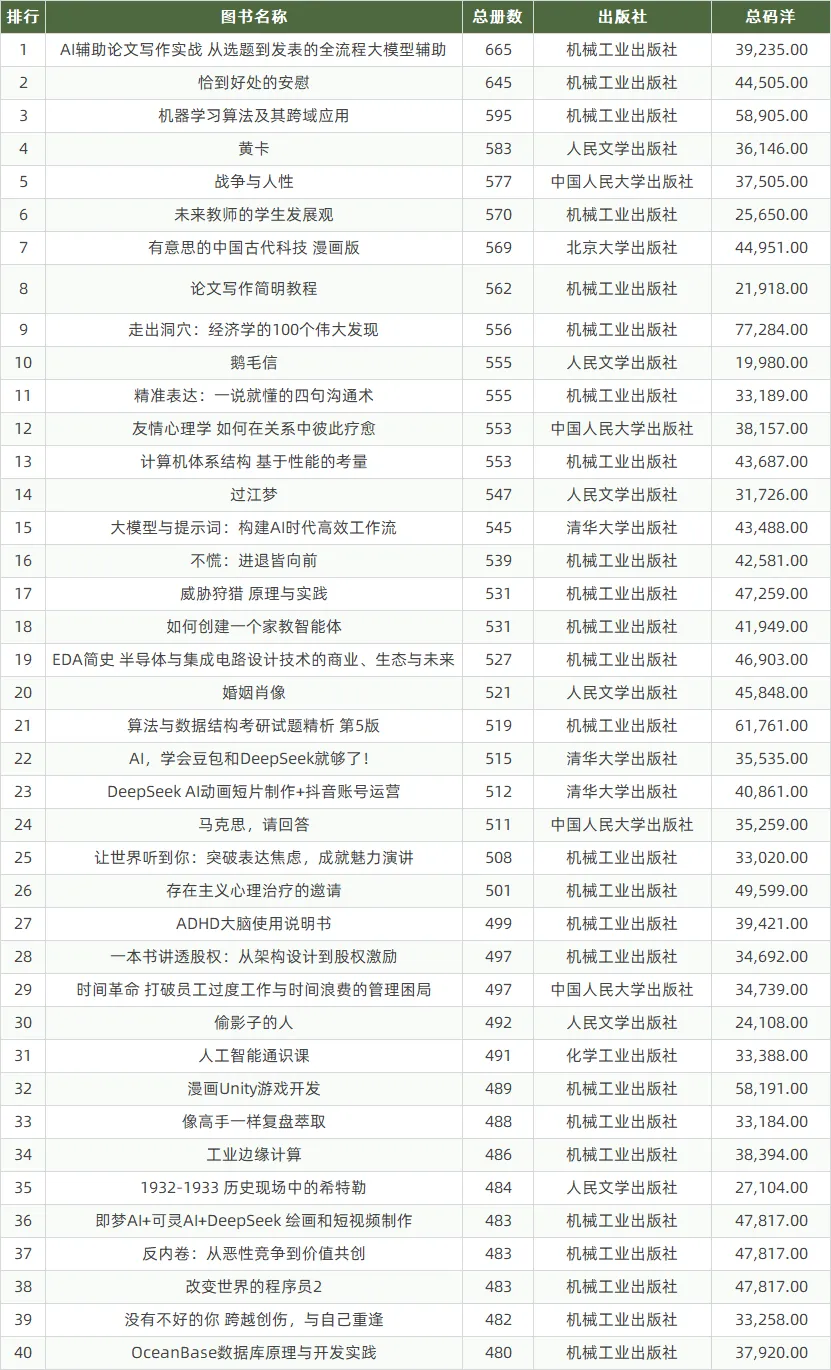 图书公司销售码洋Top20中,后浪出版咨询(北京)有限责任公司表现突出,以566.03万元码洋排在第一位;北京一棵蓝图书有限公司和北京磨铁文化集团股份有限公司位列第二、第三。此外,北京地区民营图书公司表现不俗,大众阅读与教育类图书公司各占优势。在21万余种的参展图书中,《AI辅助论文写作实战 从选题到发表的全流程大模型辅助》《恰到好处的安慰》《机器学习算法及其跨域应用》占据单品销售榜单Top3,这三种书均来自机械工业出版社。可以说,本榜单既是AI技术浪潮的直观体现,也是当下社会情绪与需求的镜像:专业技术类图书借AI东风强势领跑,心理疗愈、人文社科等赛道则持续满足大众的精神与成长需求,专业出版与大众阅读在技术与人文的交汇中找到了新的增长平衡点。从出版社分类排行情况看,中国社会科学出版社、中国科传、清华大学出版社、上海人民出版社、人民文学出版社、高等教育出版社、上海书画出版社、接力出版社、文物出版社分别占据九大类别的出版社榜首。