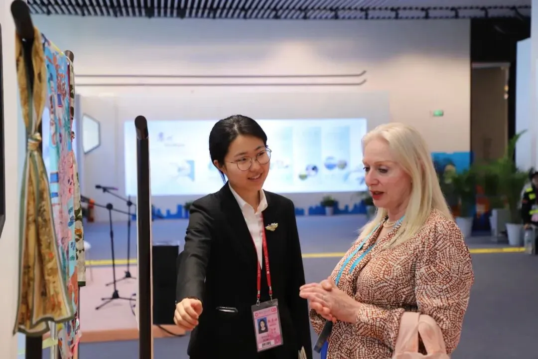 苏工苏作是凝聚苏州千年江南文化精粹,展现苏州传统工艺精美神韵的核心符号之一。作为“馆中馆”,“苏州馆”内的“苏作馆”集中展示了苏绣、缂丝、宋锦、玉雕、核雕、木雕、仿古铜器和漆器等展品,展现了苏作精、细、雅、洁的特色,每一件作品都蕴含着深厚的文化底蕴,彰显着精湛的非遗技艺,吸引了来自世界各地采购商的驻足观赏。