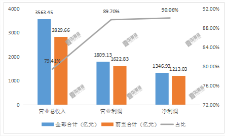 从2022年白酒行业的业绩情况来看,净利润破百亿及近百亿的玩家共有五家,分别为贵州茅台、五粮液、泸州老窖、洋河股份及山西汾酒。五名玩家的营收/营业利润/净利润合计占到了行业总值的79.41%/89.70%/90.06%。毫不夸张地说,白酒行业的“兴衰”全部取决于这五大酒厂的表现。