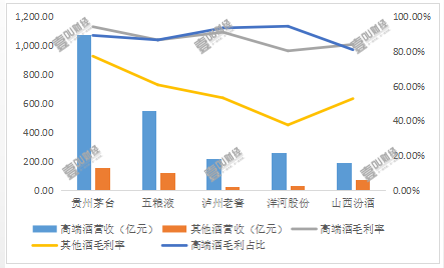 来源:2022年报头部酒企超高盈利的背后,是白酒行业的高端化。2022年头部五家酒企的高端产品都具有高占比、高利润的特点。高端产品毛利率均超过80%,几乎是其他系列酒的1.2-2倍,提供了企业近90%的毛利。