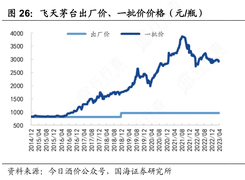 根据国海证券研究所统计,自2015年以后飞天茅台出场价仅在2018年底发生过一次小幅上调,至今保持着969元的价格。在市场流通中,一批价价格一路上涨,至2021年8月高点时在3850元/瓶左右,如果按2015年8月以出厂价819元购入,6年后卖出可以净赚3281元(2015年款在2021年8月约4100元/瓶左右)年复合收益率高达29.27%,远超任何一种金融产品及衍生品带来的回报。