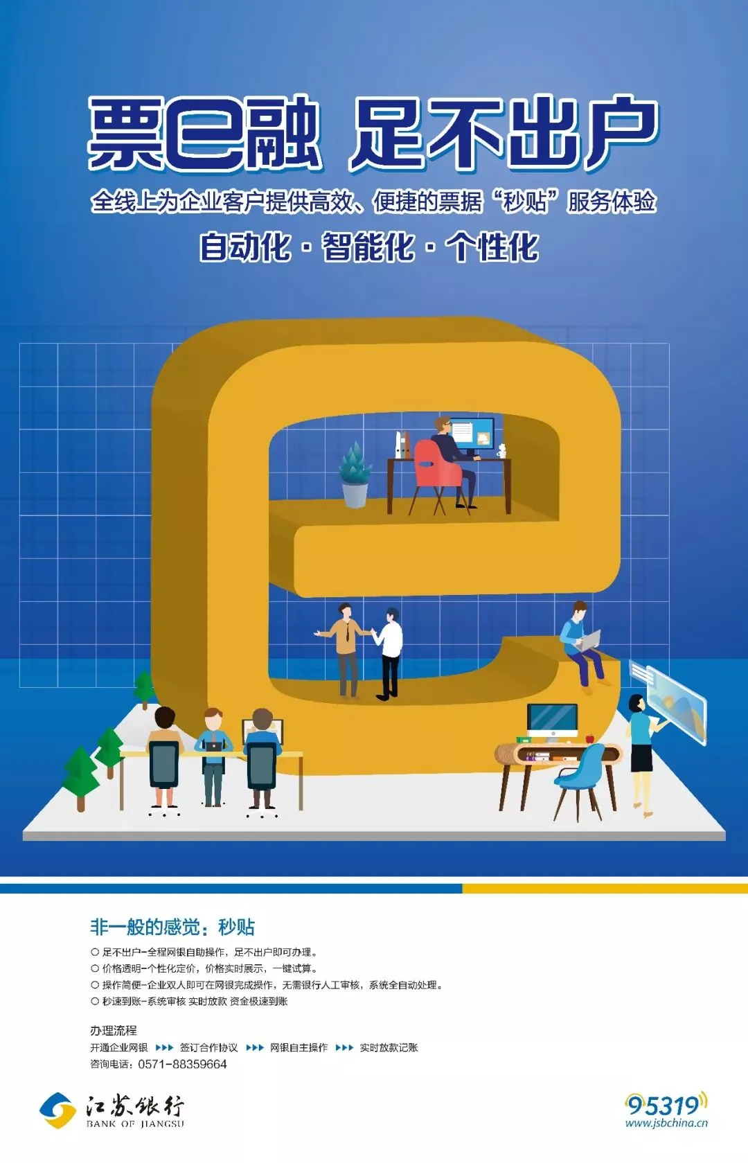 正是深切感知到了民营、小微企业的痛点,2018年4月16日,江苏银行推出了重磅产品“票e融在线贴现”。该产品兼具自动化、智能化、个性化特点,全线上为企业客户提供高效、便捷的“秒贴”服务体验,实现了足不出户、价格透明、操作简便、秒速到账等功能。以前十几步甚至更多的办理环节,现在只用四步(开通企业网银、签订合作协议、网银自主操作、实时放款记账)就能轻松搞定。