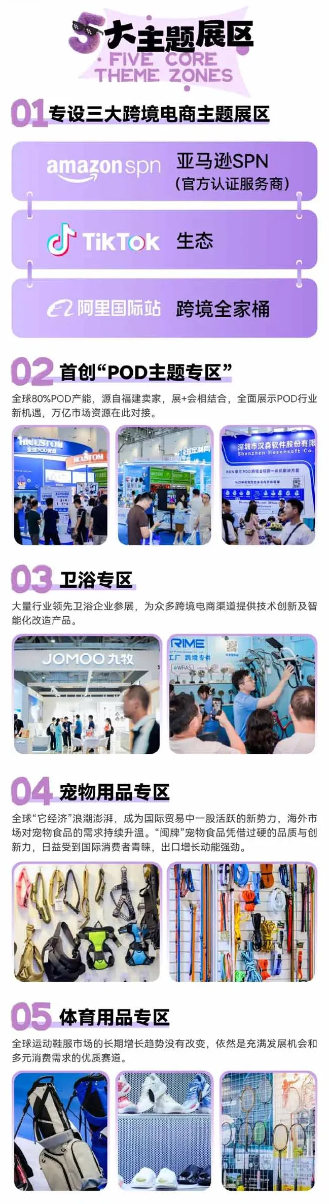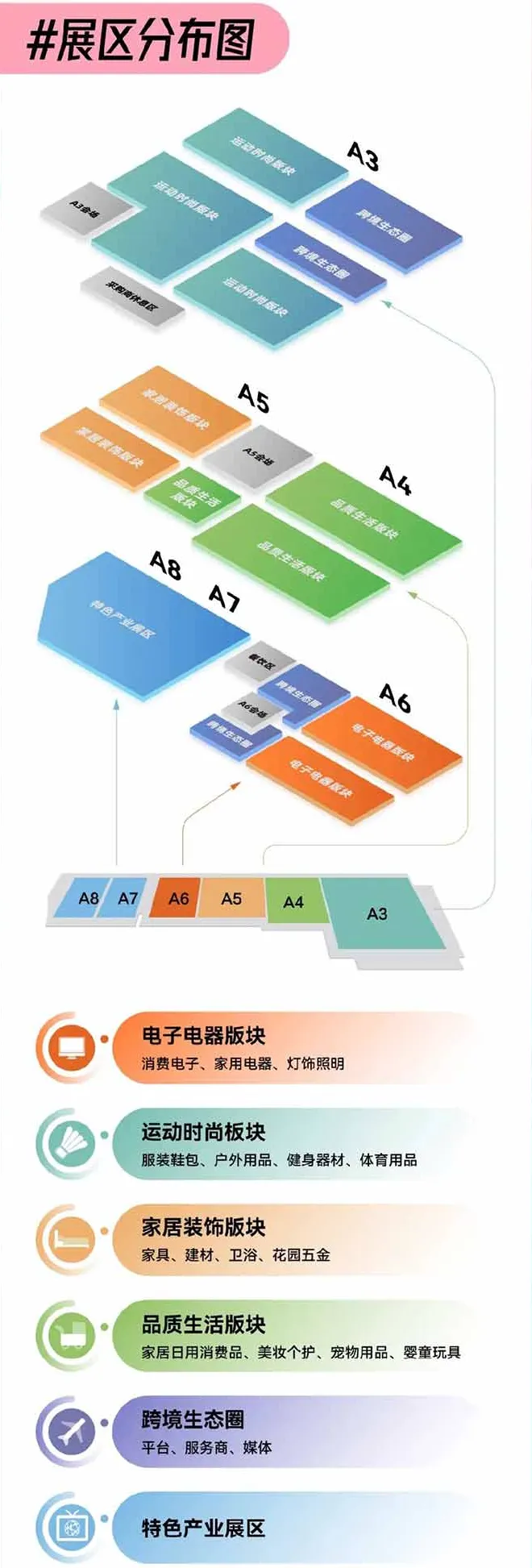 一、各地特色产业带:涵盖鞋服箱包、体育用品、家居卫浴、花园五金、日用消费品、宠物用品、婴童玩具、美妆个护、消费电子、家用电器、灯饰照明等。