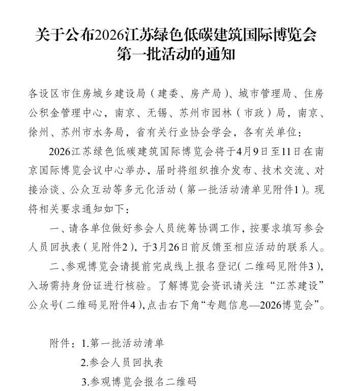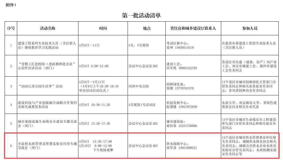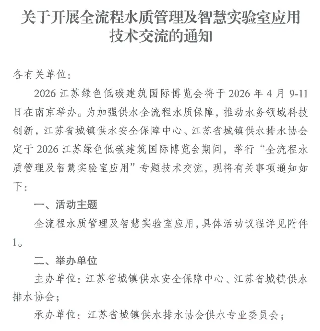 2026江苏绿色低碳建筑国际博览会将于2026年4月9-11日在南京举办。为加强供水全流程水质保障,推动水务领域科技创新,江苏省城镇供水安全保障中心、江苏省城镇供水排水协会定于2026江苏绿色低碳建筑国际博览会期间,举行“全流程水质管理及智慧实验室应用”专题技术交流,现将有关事项通知如下。