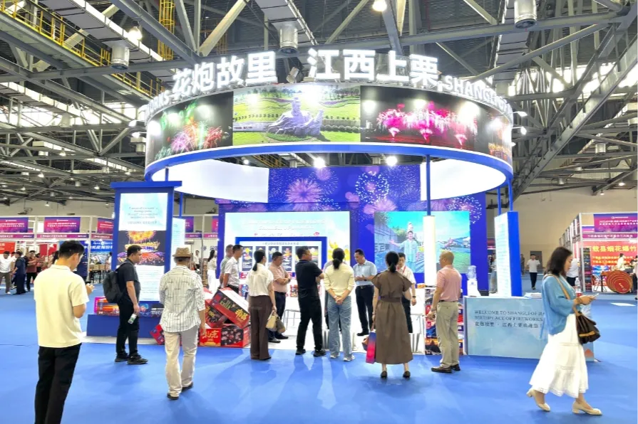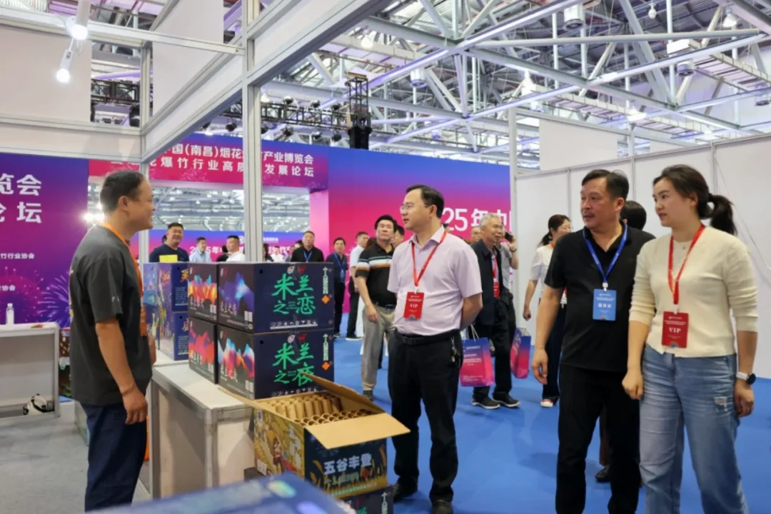 在巡馆环节,上栗县精心打造的“花炮故里·江西上栗”主题展区成为焦点,展区通过陈列精美烟花样品、播放产业宣传片等形式,生动呈现了上栗花炮的悠久历史与现代科技创新的融合成果,吸引众多参展商驻足交流。
