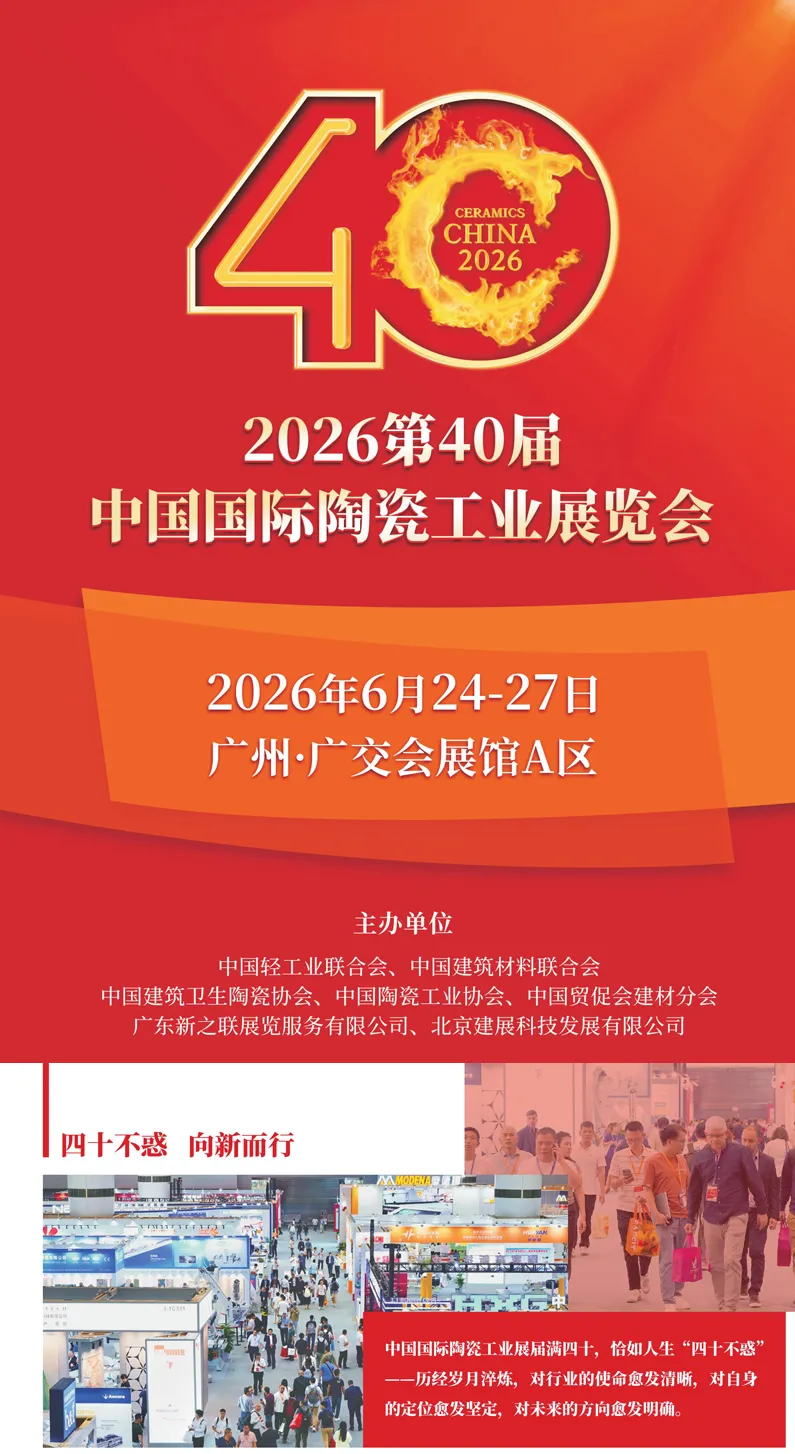 2026第40届中国国际陶瓷工业展览会6月24-27日在广交会展馆A区举办!预计展览规模将超过80,000平方米,中外展商850多家,参展品牌1200多个,将吸引90多个国家和地区的业内观众和专业买家约9万人次到场参观采购。