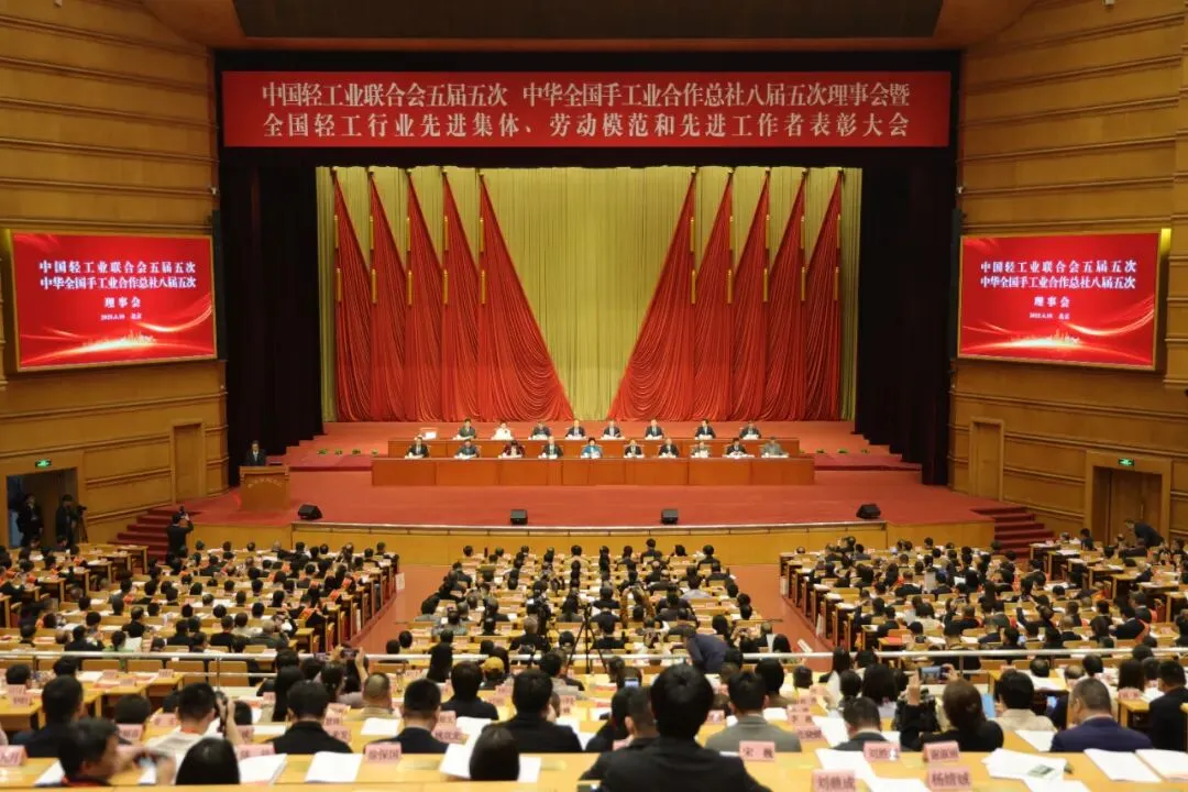 2025年4月10日,中国轻工业联合会五届五次理事会、中华全国手工业合作总社八届五次理事会暨全国轻工行业先进集体、劳动模范和先进工作者表彰大会在京举行。第十届全国人大常委会副委员长、中国关心下一代工作委员会主任顾秀莲,中国财贸轻纺烟草工会主席刘小昶,人力资源社会保障部表彰奖励办公室副主任、一级巡视员陈祎,中央社会工作部二局副局长曹志平,国资委轻工机关服务中心主任王顺荣,会社领导张崇和、王世成、杜同和、陶小年、徐祥楠、何烨、刘江毅、李玉中、郭永新、刘素文,会社老领导陈士能、步正发、潘蓓蕾、钱桂敬等出席了会议。中轻联、总社理事单位,机关各部室,协会、学会、直属单位,科研院所(校)负责人等参加了会议。