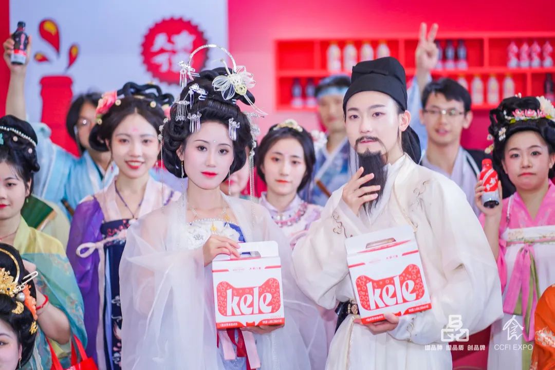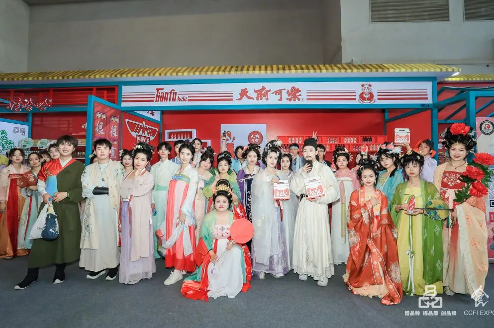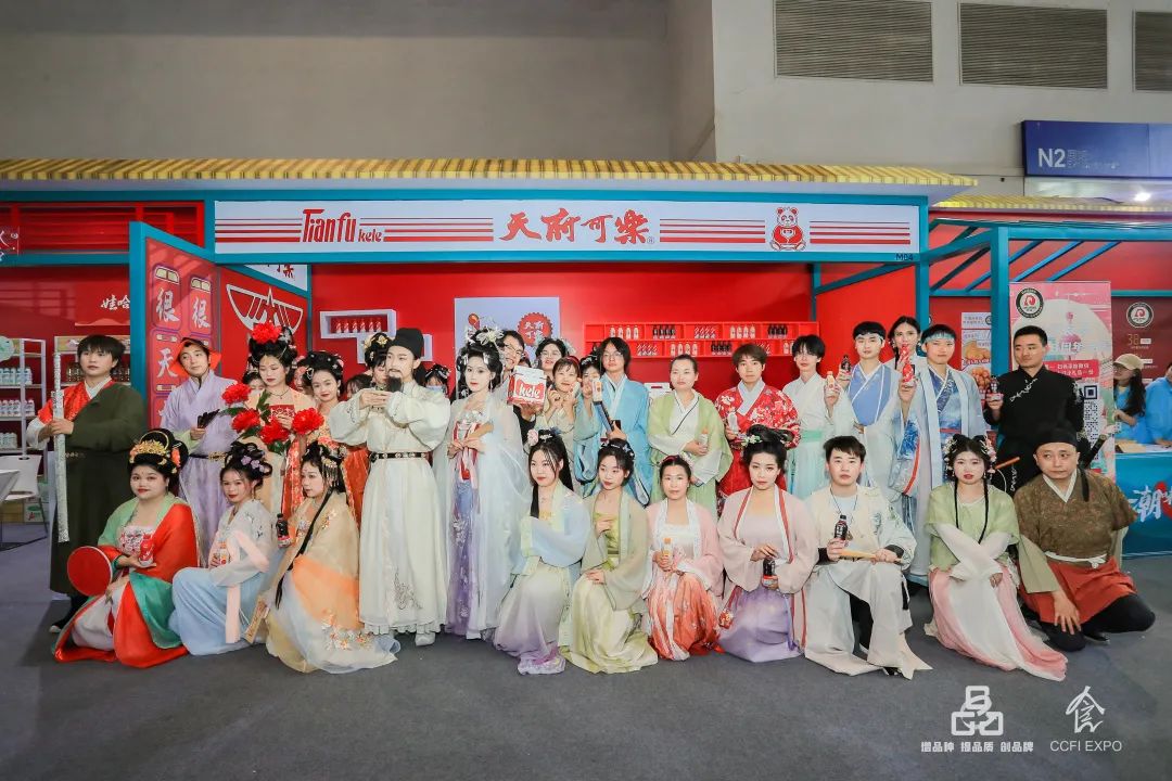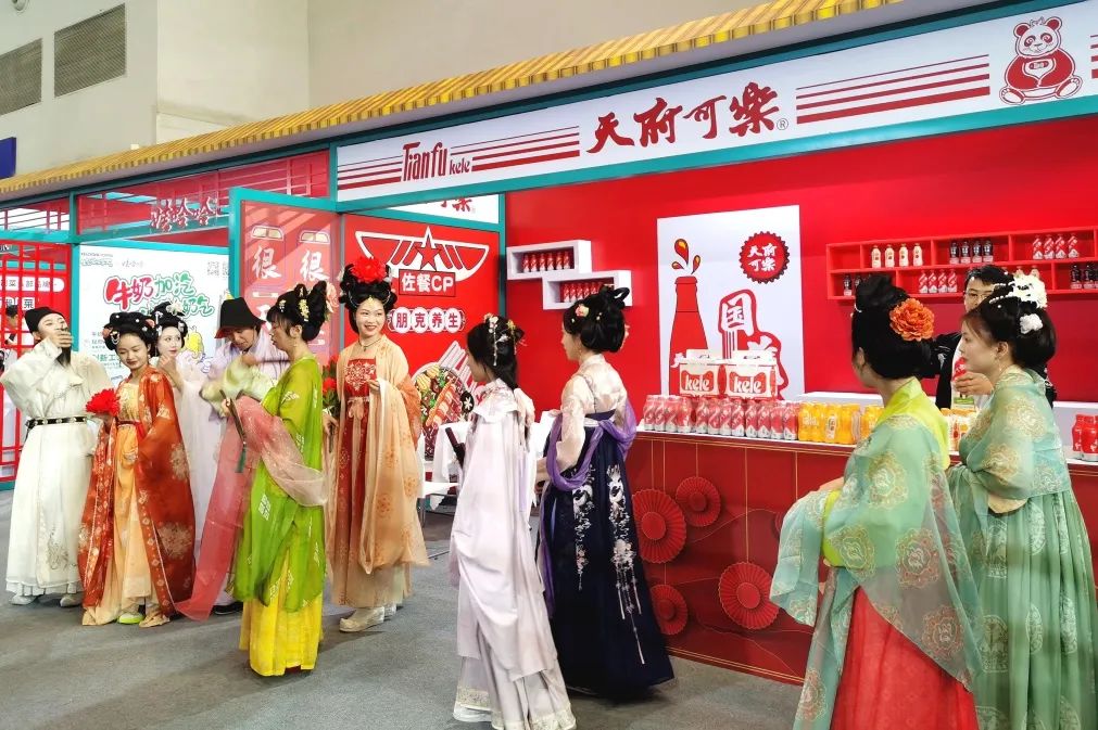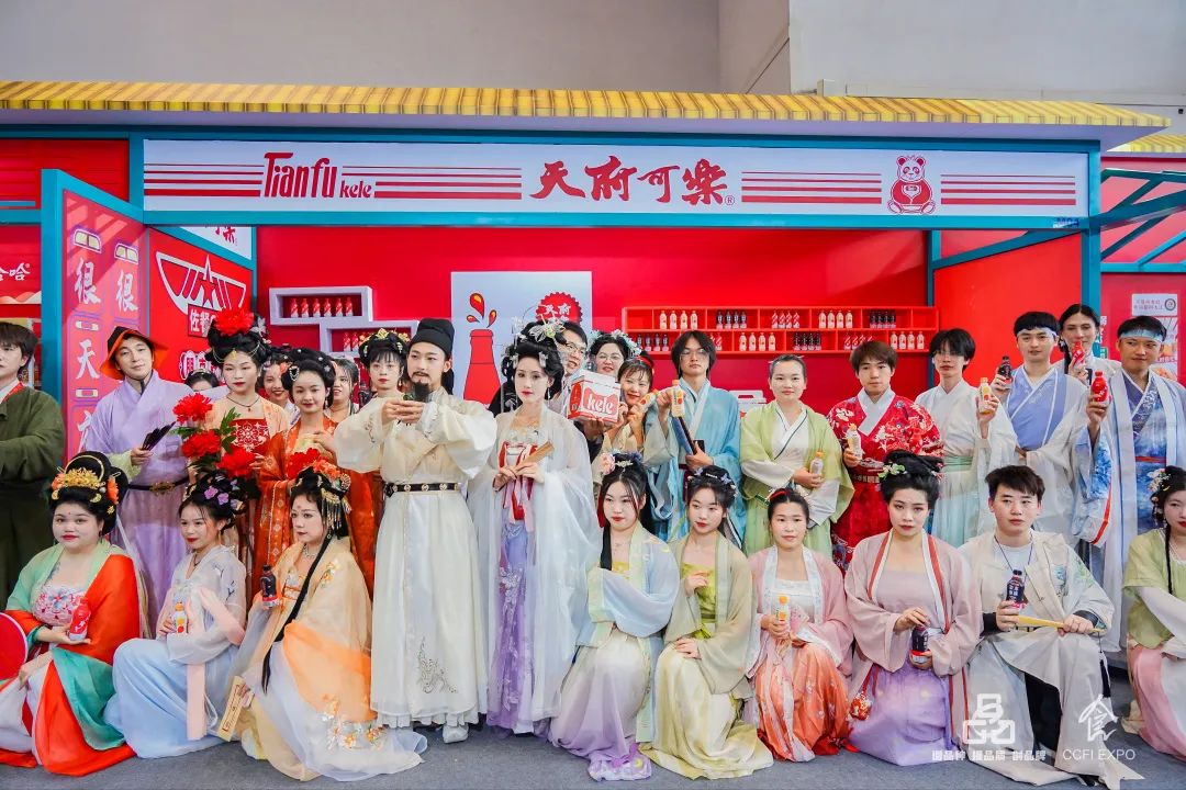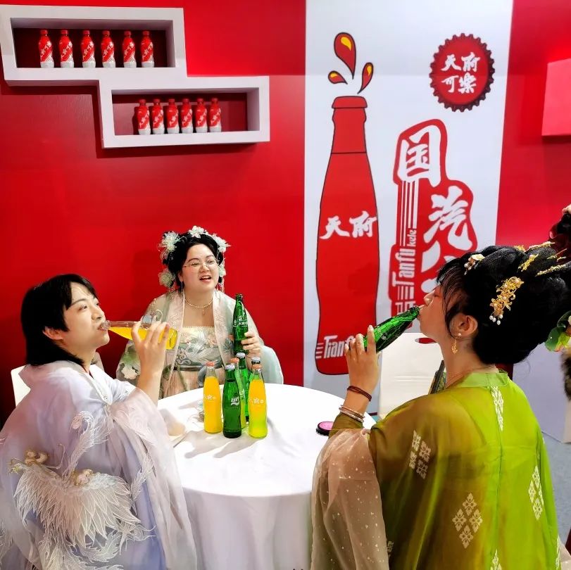 看国潮大秀,喝国潮天府可乐!展馆内,一群身着国风汉服的年轻人打卡拍照,喝着草本味的天府可乐,展现国潮魅力。