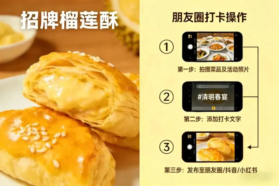 提前三天预定任意踏青宴,立享9折优惠,还能免费获赠榴莲酥 1 份,省心又划算!