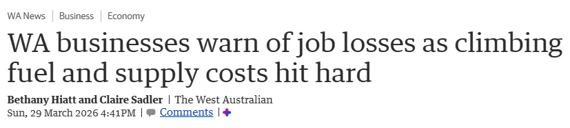 据《西澳人报》3月30日报道,燃油和运输成本持续上涨,西澳企业主担忧,为了维持生意,他们可能不得不裁员或缩短员工工时。