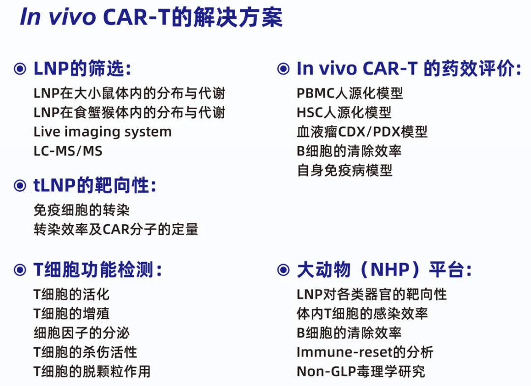 针对In vivo CAR-T这一异军突起的研发赛道,公司打造了一体化的服务平台,可满足in vivo CAR-T的临床前评价需求。这些评价方案包括LNP的筛选,tLNP的靶向性评价,T细胞的功能检测,利用人源化小鼠模型来评价体内药效,以及利用非人灵长类动物(NHP)平台来评价LNP的生物发布、代谢、B细胞的清除效率及immune-reset的深度,以及早期毒理学研究等。