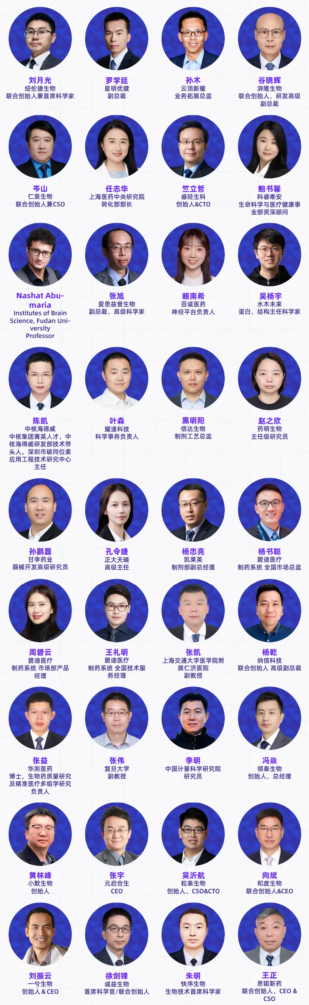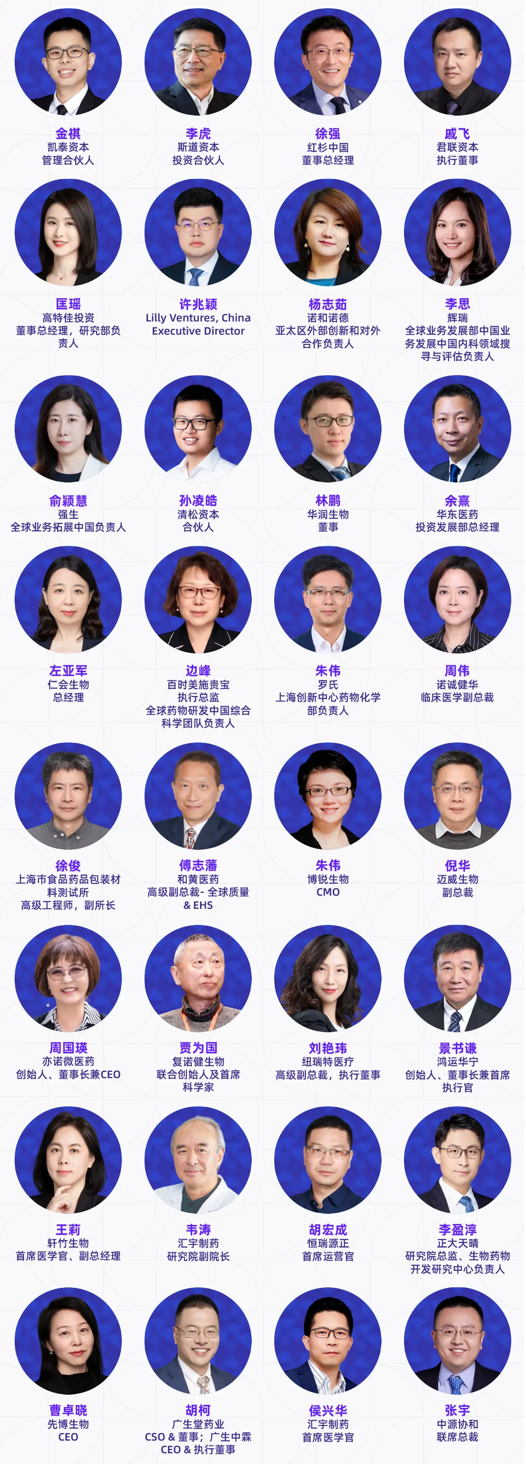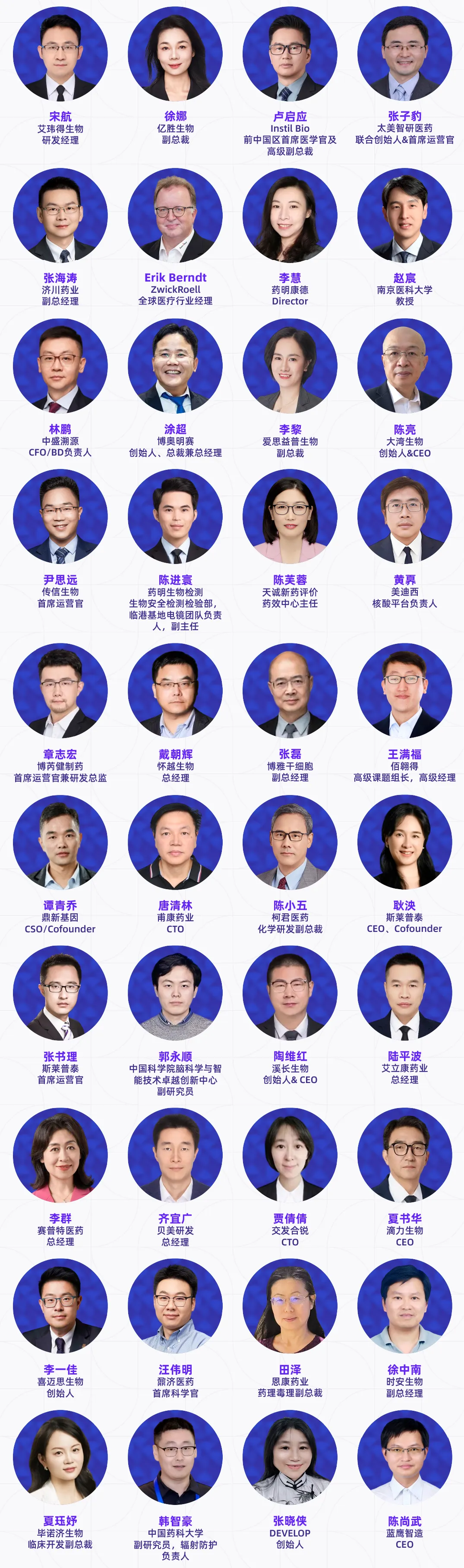 演讲嘉宾涵盖跨国药企、国内外药企、Biotech高管、创始人、全球开发负责人及核心技术负责人、头部CRO/CDMO管理层及技术专家、科研院所研究学者、临床研究负责人以及投资决策人等产业实践者,他们代表行业领先水平,直接参与真实项目的立项评估、早期发现、临床前研究、临床推进、工艺放大与全球注册路径设计等环节。