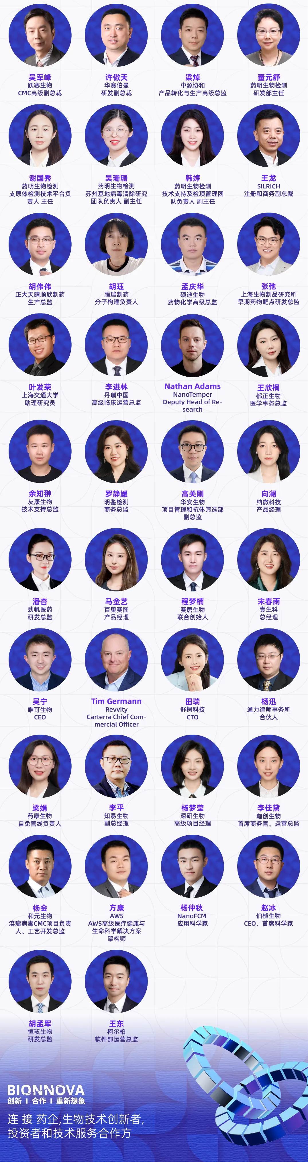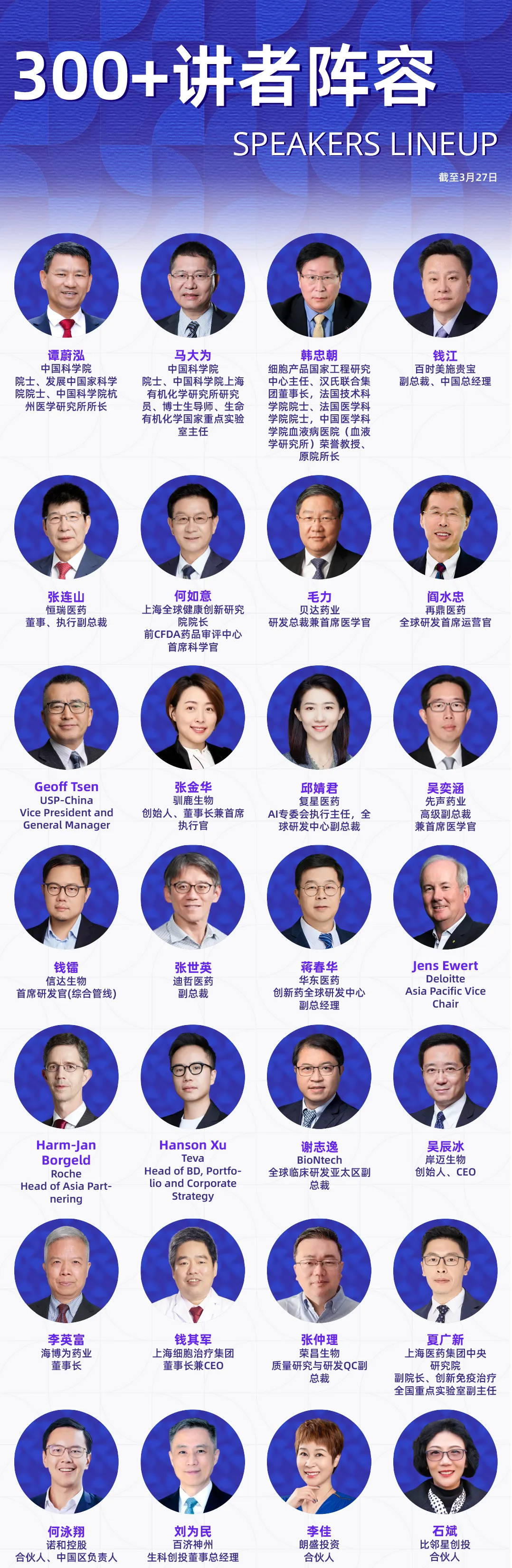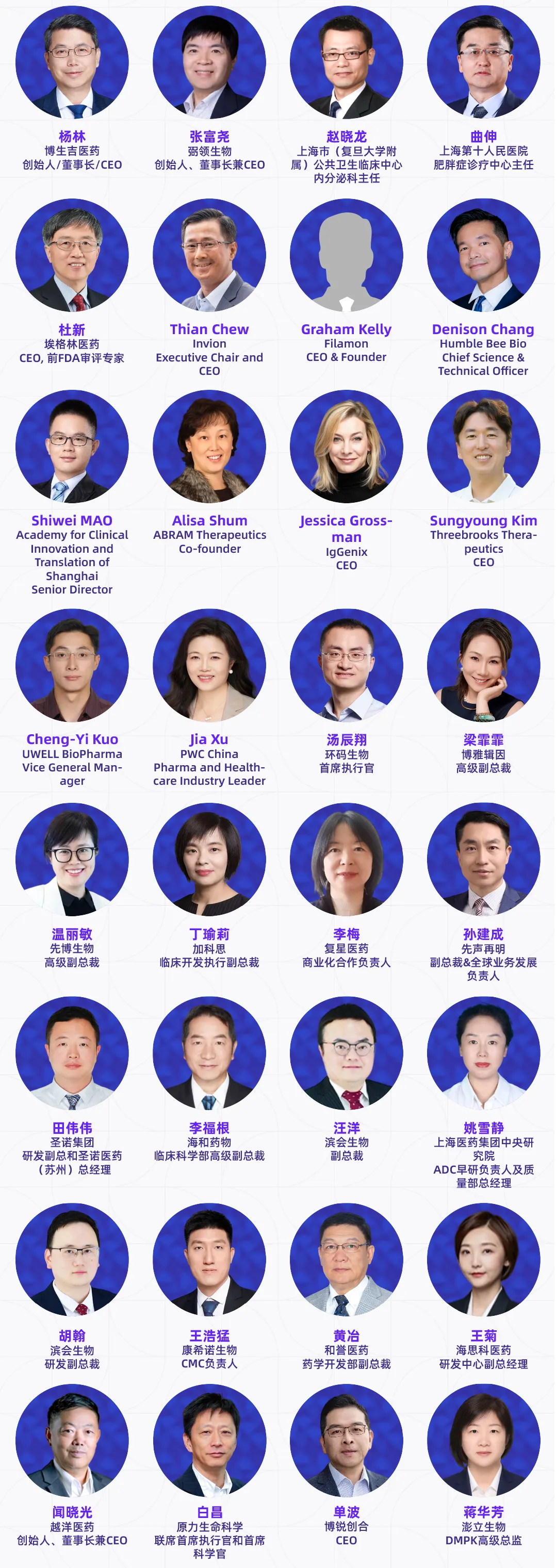 演讲嘉宾涵盖跨国药企、国内外药企、Biotech高管、创始人、全球开发负责人及核心技术负责人、头部CRO/CDMO管理层及技术专家、科研院所研究学者、临床研究负责人以及投资决策人等产业实践者,他们代表行业领先水平,直接参与真实项目的立项评估、早期发现、临床前研究、临床推进、工艺放大与全球注册路径设计等环节。