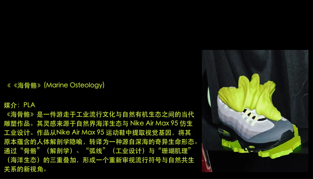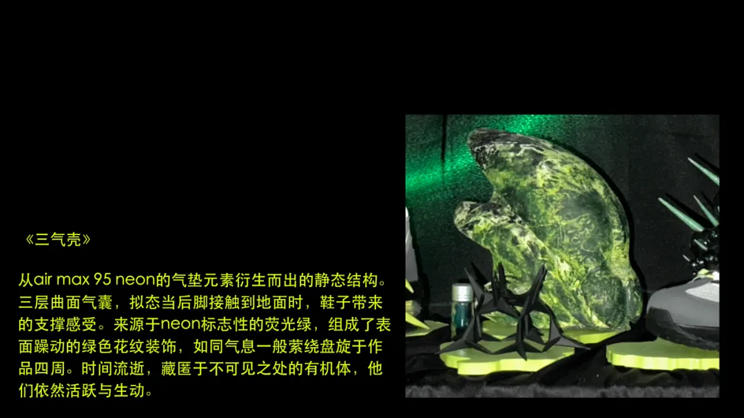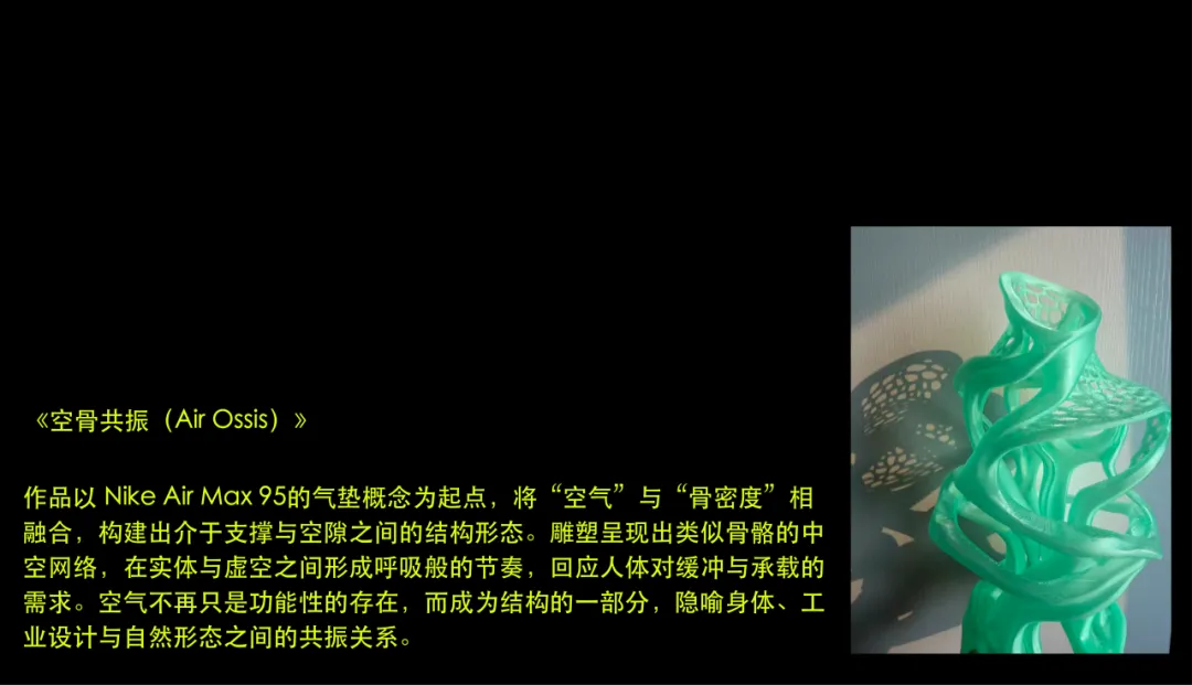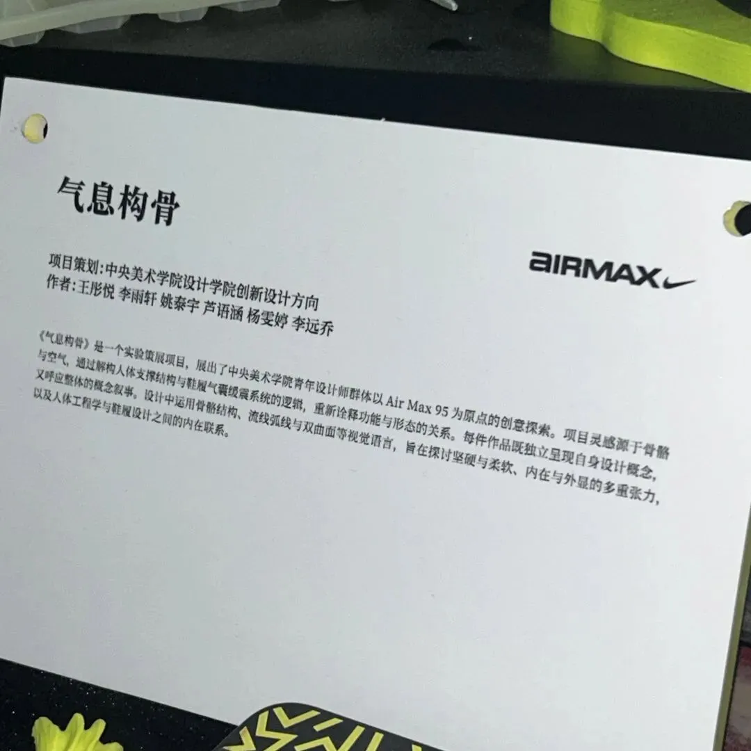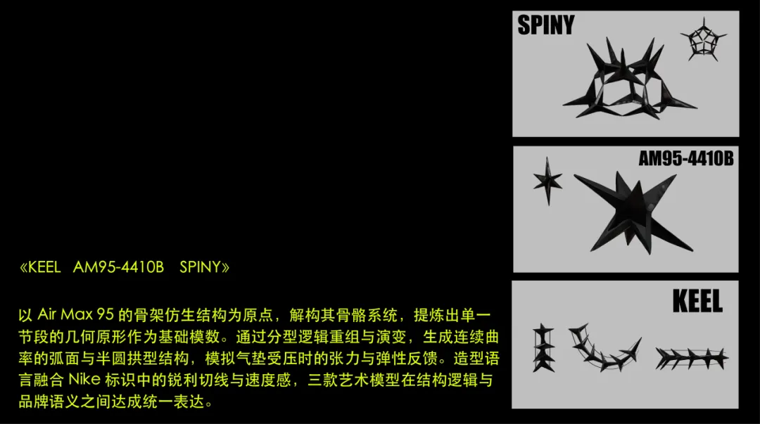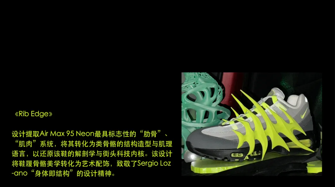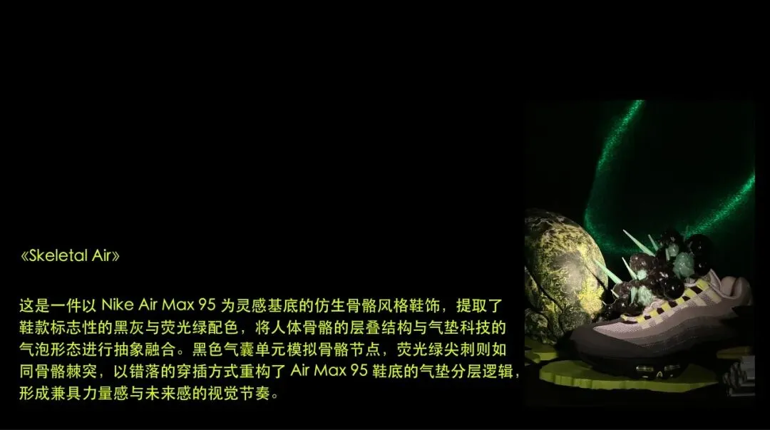 项目简介:《气息构骨》是一个实验策展项目,展出了中央美术学院青年设计师群体以 Nike Air Max 95 为原点的创意探索。项目灵感源于骨骼与空气,通过解构人体支撑结构与鞋履气囊缓震系统的逻辑,重新诠释功能与形态的关系。每件作品既独立呈现自身设计概念,又呼应整体的概念叙事。设计中运用骨骼结构、流线弧线与双曲面等视觉语言,旨在探讨坚硬与柔软、内在与外显的多重张力,以及人体工程学与鞋履设计之间的内在联系。